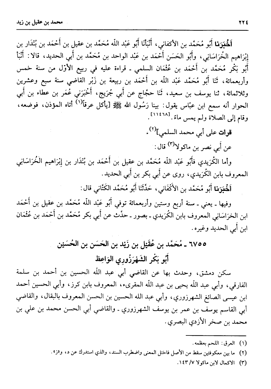 أخبرنا أبو محمد بن الأكفاني أنبأنا أبو عبد الله محمد بن عقيل بن أحمد بن بندار بن إبراهيم الخراساني وأبو الحسن أحمد بن عبد الواحد بن محمد بن أبي الحديد قالا أنبأنا أبو بكر محمد بن أحمد بن عثمان السلمي قراءة عليه في ربيع الأول من سنة خمس وأربعمائة ثنا أبو محمد عبد الله بن أحمد بن ربيعة بن زبر القاضي سنة سبع وعشرين وثلاثمائة ثنا يوسف بن سعيد ثنا حجاج عن أبي جريج أخبرني عمر بن عطاء بن أبي الحوار أنه سمع ابن عباس يقول بينا رسول الله (صلى الله عليه وسلم) يأكل عرقا (1) أتاه المؤذن فوضعه وقام إلى الصلاة ولم يمس ماء