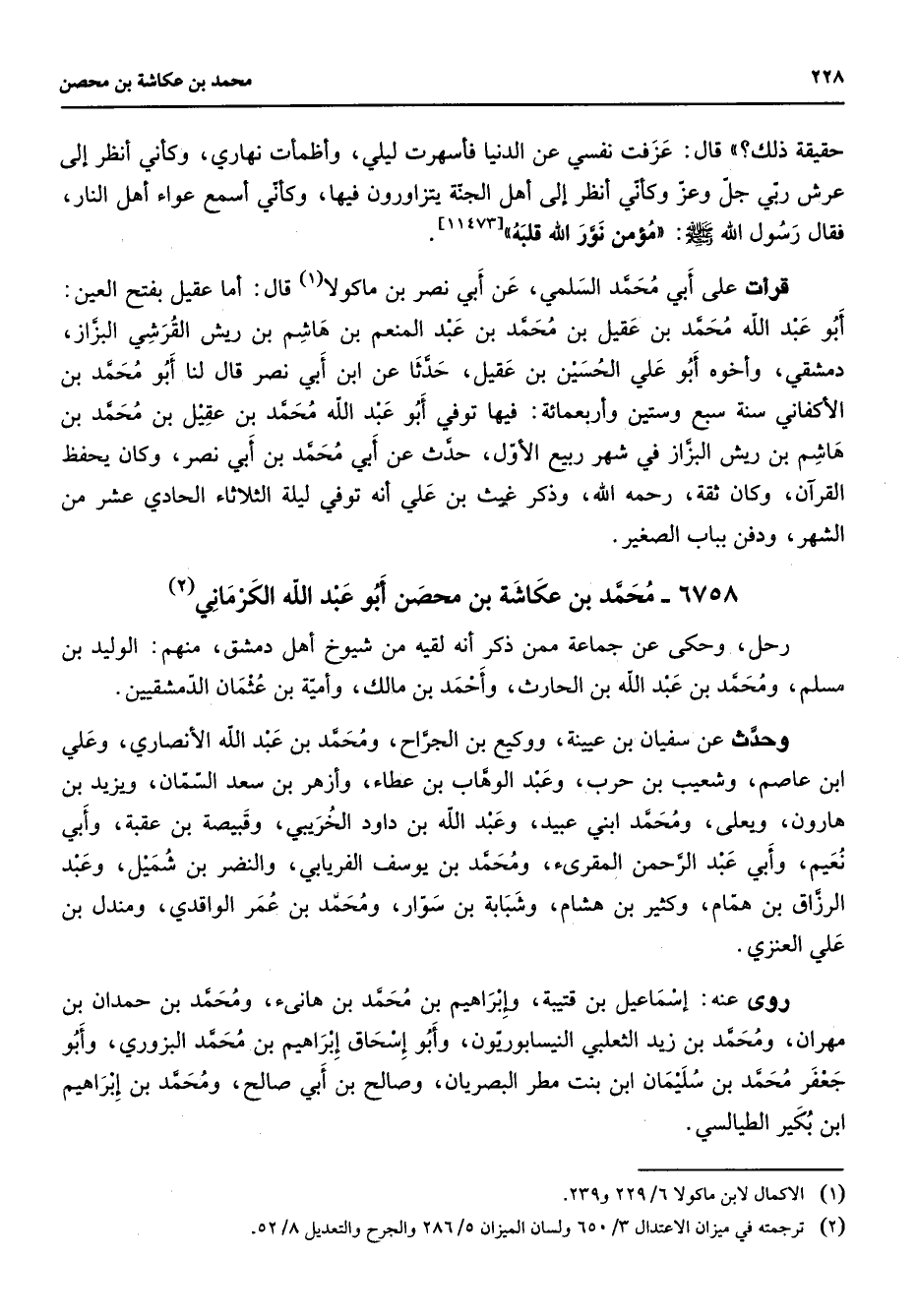 6758 - محمد بن عكاشة بن محصن أبو عبد الله الكرماني (2) رحل وحكى عن جماعة ممن ذكر أنه لقيه من شيوخ أهل دمشق منهم الوليد بن مسلم ومحمد بن عبد الله بن الحارث وأحمد بن مالك وأمية بن عثمان الدمشقيين وحدث عن سفيان بن عيينة ووكيع بن الجراح ومحمد بن عبد الله الأنصاري وعلي ابن عاصم وشعيب بن حرب وعبد الوهاب بن عطاء وأزهر بن سعد السمان ويزيد بن هارون ويعلى ومحمد ابني عبيد وعبد الله بن داود الخريبي وقبيصة بن عقبة وأبي نعيم وأبي عبد الرحمن المقرئ ومحمد بن يوسف الفريابي والنضر بن شميل وعبد الرزاق بن همام وكثير بن هشام وشبابة بن سوار ومحمد بن عمر الواقدي ومندل بن علي العنزي روى عنه إسماعيل بن قتيبة وإبراهيم بن محمد بن هانئ ومحمد بن حمدان بن مهران ومحمد بن زيد الثعلبي النيسابوريون وأبو إسحاق إبراهيم بن محمد البزوري وأبو جعفر محمد بن سليمان ابن بنت مطر البصريان وصالح بن أبي صالح ومحمد بن إبراهيم ابن بكير الطيالسي