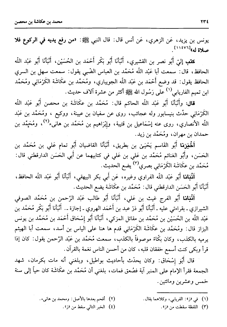 [11476] كتب إلى أبو نصر بن القشيري أنبأنا أبو بكر أحمد بن الحسين أنبأنا أبو عبد الله الحافظ قال سمعت أبا عبد الله محمد بن العباس الضبي يقول سمعت سهل بن السري الحافظ يقول قد وضع أحمد بن عبد الله الجويباري ومحمد بن عكاشة الكرماني ومحمد ابن تميم الفاريابي (1) على رسول الله (صلى الله عليه وسلم) أكثر من عشرة آلاف حديث قال وأنبأنا أبو عبد الله الحاكم قال محمد بن عكاشة بن محصن أبو عبد الله الكرماني حدث بنيسابور وله عجائب روى عن سفيان بن عيينة ووكيع ومحمد بن عبد الله الأنصاري روى عنه إسماعيل بن قتيبة وإبراهيم بن محمد بن هانئ (2) ومحمد بن حمدان بن مهران ومحمد بن زيد أخبرنا أبو القاسم يحيى بن بطريق أنبأنا القاضيان أبو تمام علي بن محمد بن الحسن وأبو الغنائم محمد بن علي بن علي في كتابيهما عن أبي الحسن الدارقطني قال محمد بن عكاشة الكرماني بصري (3) يضع الحديث أنبأنا أبو عبد الله الفراوي وغيره عن أبي بكر البيهقي أنبأنا أبو عبد الله الحافظ أنبأنا أبو الحسن الدارقطني قال محمد بن عكاشة يضع الحديث أنبأنا أبو الفرج غيث بن علي أنبأنا أبو طالب عبد الرحمن بن محمد الصوفي الشيرازي بقراءتي عليه أنبأنا أبو ذر عبد بن أحمد الهروي إجازة أنبأنا أبو بكر محمد بن عبد الله بن الحسين بن محمد بن مقاتل المزكي أنبأنا أبو إسحاق أحمد بن محمد بن يونس البزاز قال ومحمد بن عكاشة الكرماني قدم هاهنا على الياس بن أسد سمعت أبا الهيثم يرميه بالكذب وكان بكاء موصوفا بالكذب سمعت محمد بن عبد الرحمن يقول كان إذا قرأ وبكى كنت أسمع خفقان قلبه كان من أحسن الناس نغمة بالقرآن قال أبو إسحاق وكان يحدث بأحاديث بواطيل وبلغني أنه مات بكرمان شهد الجمعة فقرأ الإمام على المنبر آية فصعق فمات بلغني أن محمد بن عكاشة كان حيا إلى سنة خمس وعشرين ومائتين