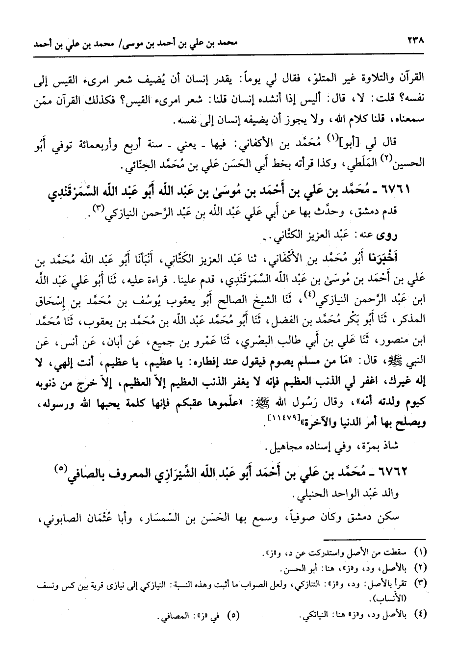 6761 - محمد بن علي بن أحمد بن موسى بن عبد الله أبو عبد الله السمرقندي قدم دمشق وحدث بها عن أبي علي عبد الله النيازكي (3) روى عنه عبد العزيز الكتاني أخبرنا أبو محمد بن الأكفاني ثنا عبد العزيز الكتاني أنبأنا أبو عبد الله محمد بن علي بن أحمد بن موسى بن عبد الله السمرقندي قدم علينا قراءة عليه ثنا أبو علي عبد الله ابن عبد الرحمن النيازكي (4) ثنا الشيخ الصالح أبو يعقوب يوسف بن محمد بن إسحاق المذكر ثنا أبو بكر محمد بن الفضل ثنا أبو محمد عبد الله بن محمد بن يعقوب ثنا محمد ابن منصور ثنا علي بن أبي طالب البصري ثنا عمرو بن جميع عن أبان عن أنس عن النبي (صلى الله عليه وسلم) قال ما من مسلم يصوم فيقول عند إفطاره يا عظيم يا عظيم أنت إلهي لا إله غيرك اغفر لي الذنب العظيم فإنه لا يغفر الذنب العظيم إلا العظيم إلا خرج من ذنوبه كيوم ولدته أمه وقال رسول الله (صلى الله عليه وسلم) علموها عقبكم فإنها كلمة يحبها الله ورسوله ويصلح بها أمر الدنيا والآخرة