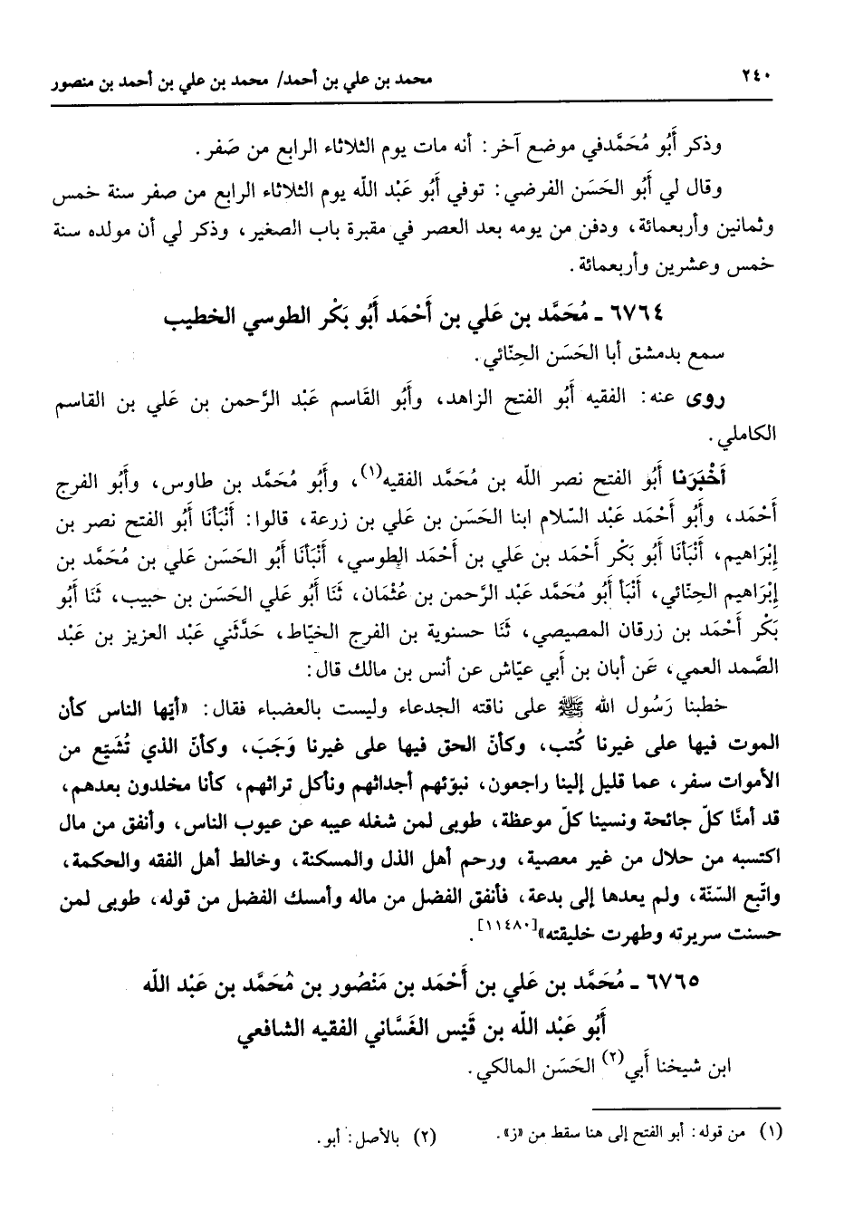 6764 - محمد بن علي بن أحمد أبو بكر الطوسي الخطيب سمع بدمشق أبا الحسن الحنائي روى عنه الفقيه أبو الفتح الزاهد وأبو القاسم عبد الرحمن بن علي بن القاسم الكاملي أخبرنا أبو الفتح نصر الله بن محمد الفقيه (1) وأبو محمد بن طاوس وأبو الفرج أحمد وأبو أحمد عبد السلام ابنا الحسن بن علي بن زرعة قالوا أنبأنا أبو الفتح نصر بن إبراهيم أنبأنا أبو بكر أحمد بن علي بن أحمد الطوسي أنبأنا أبو الحسن علي بن محمد بن إبراهيم الحنائي أنبأنا أبو محمد عبد الرحمن بن عثمان ثنا أبو علي الحسن بن حبيب ثنا أبو بكر أحمد بن زرقان المصيصي ثنا حسنوية بن الفرج الخياط حدثني عبد العزيز بن عبد الصمد العمي عن أبان بن أبي عياش عن أنس بن مالك قال خطبنا رسول الله (صلى الله عليه وسلم) على ناقته الجدعاء وليست بالعضباء فقال أيها الناس كأن الموت فيها على غيرنا كتب وكأن الحق فيها على غيرنا وجب وكأن الذي تشيع من الأموات سفر عما قليل إلينا راجعون نبوئهم أجداثهم ونأكل تراثهم كأنا مخلدون بعدهم قد أمنا كل جائحة ونسينا كل موعظة طوبى لمن شغله عيبه عن عيوب الناس وأنفق من مال اكتسبه من حلال من غير معصية ورحم أهل الذل والمسكنة وخالط أهل الفقه والحكمة واتبع السنة ولم يعدها إلى بدعة فأنفق الفضل من ماله وأمسك الفضل من قوله طوبى لمن حسنت سريرته وطهرت خليقته