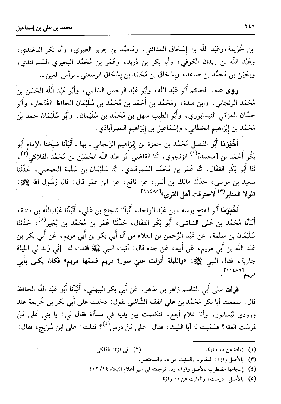 [11486] قرأت على أبي القاسم زاهر بن طاهر عن أبي بكر البيهقي أنبأنا أبو عبد الله الحافظ قال سمعت أبا بكر محمد بن علي الفقيه الشاشي يقول دخلت على أبي بكر بن خزيمة عند ورودي نيسابور وأنا غلام أيفع فتكلمت بين يديه في مسألة فقال لي يا بني على من درست الفقه فسميت له أبا الليث فقال على من درس (5) فقلت على ابن سريج فقال
