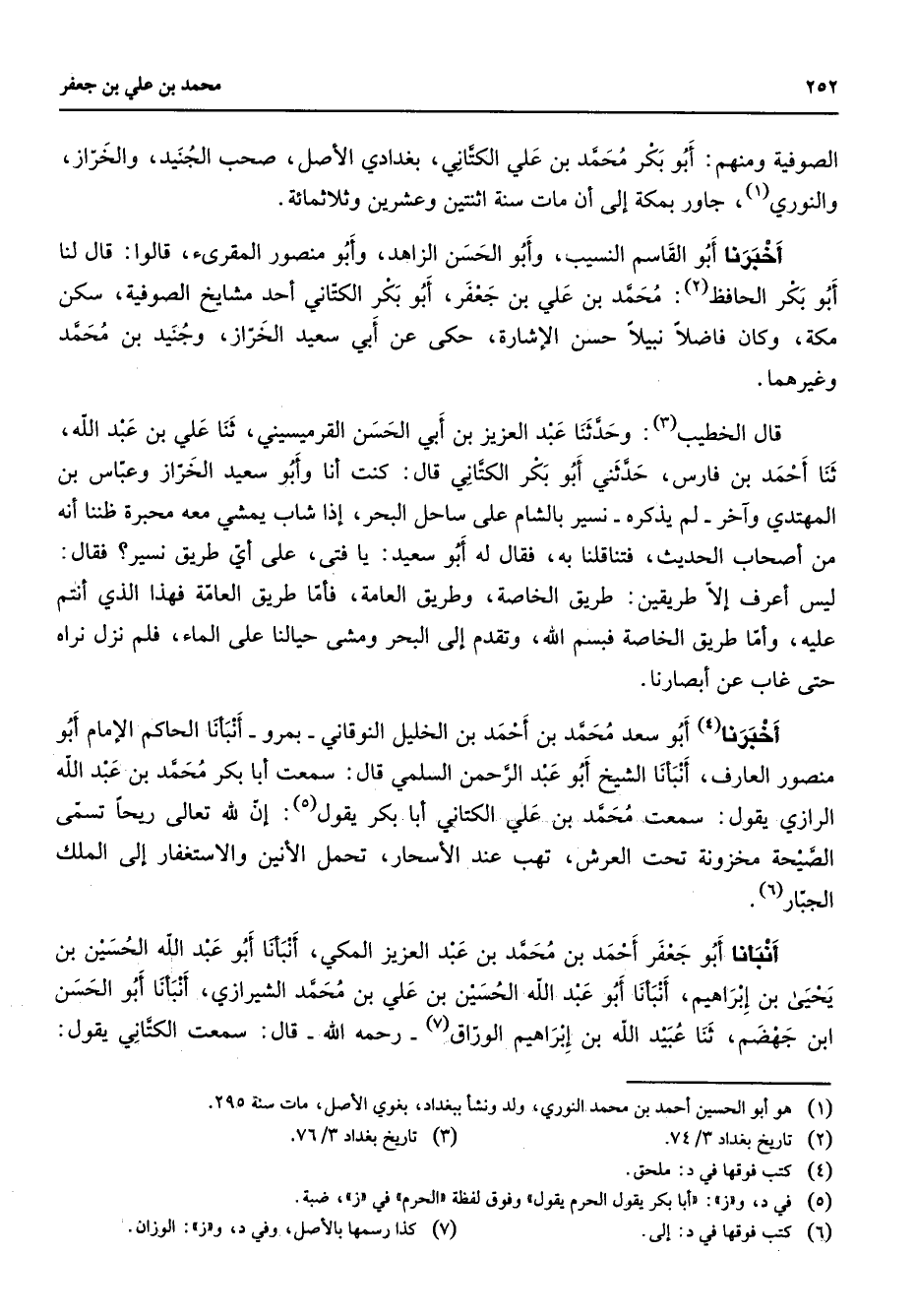 الصوفية ومنهم أبو بكر محمد بن علي الكتاني بغدادي الأصل صحب الجنيد والخراز والنوري (1) جاور بمكة إلى أن مات سنة اثنتين وعشرين وثلاثمائة أخبرنا أبو القاسم النسيب وأبو الحسن الزاهد وأبو منصور المقرئ قالوا قال لنا أبو بكر الحافظ (2) محمد بن علي بن جعفر أبو بكر الكتاني أحد مشايخ الصوفية سكن مكة وكان فاضلا نبيلا حسن الإشارة حكى عن أبي سعيد الخراز وجنيد بن محمد وغيرهما قال الخطيب (3) وحدثنا عبد العزيز بن أبي الحسن القرميسيني ثنا علي بن عبد الله ثنا أحمد بن فارس حدثني أبو بكر الكتاني قال كنت أنا وأبو سعيد الخراز وعباس بن المهتدي وآخر لم يذكره نسير بالشام على ساحل البحر إذا شاب يمشي معه محبرة ظننا أنه من أصحاب الحديث فتناقلنا به فقال له أبو سعيد يا فتى على أي طريق نسير فقال ليس أعرف إلا طريقين طريق الخاصة وطريق العامة فأما طريق العامة فهذا الذي أنتم عليه وأما طريق الخاصة فبسم الله تقدم إلى البحر ومشى حيالنا على الماء فلم نزل نراه حتى غاب عن أبصارنا أخبرنا (4) أبو سعد محمد بن أحمد بن الخليل النوقاني بمرو أنبأنا الحاكم الإمام أبو منصور العارف أنبأنا الشيخ أبو عبد الرحمن السلمي قال سمعت أبا بكر محمد بن عبد الله الرازي يقول سمعت محمد بن علي الكتاني أبا بكر يقول (5) إن لله تعالى ريحا تسمى الصيحة مخزونة تحت العرش تهب عند الأسحار تحمل الأنين والاستغفار إلى الملك الجبار (6) أنبأنا أبو جعفر أحمد بن محمد بن عبد العزيز المكي أنبأنا أبو عبد الله الحسين بن يحيى بن إبراهيم أنبأنا أبو عبد الله الحسين بن علي بن محمد الشيرازي أنبأنا أبو الحسن ابن جهضم ثنا عبيد الله بن إبراهيم الوراق (7) رحمه الله قال سمعت الكتاني يقول