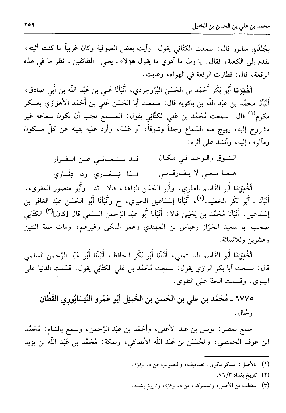 بجندي سابور قال سمعت الكتاني يقول رأيت بعض الصوفية وكان غريبا ما كنت أثبته تقدم إلى الكعبة فقال يا رب ما أدري ما يقول هؤلاء يعني الطائفين انظر إلى ما في هذه الرقعة قال فطارت الرقعة في الهواء وغابت أخبرنا أبو بكر أحمد بن الحسن البروجردي أنبأنا علي بن عبد الله بن أبي صادق أنبأنا محمد بن عبد الله بن باكويه قال سمعت أبا الحسن علي بن أحمد الأهوازي بعسكر مكرم (1) قال سمعت محمد بن علي الكتاني يقول المستمع يجب أن يكون سماعه غير مشروح إليه يهيج منه السماع وجدا وشوقا أو غلبة وأرد عليه يقينه عن كل مسكون ومألوف إليه وأنشد على أثره * الشوق والوجد في مكان * قد منعاني عن الفرار هما معي لا يفارقاني * فذا شعاري وذا دثاري * أخبرنا أبو القاسم العلوي وأبو الحسن الزاهد قالا ثنا وأبو منصور المقرئ أنبأنا أبو بكر الخطيب (2) أنبأنا إسماعيل الحيري ح وأنبأنا أبو الحسن عبد الغافر بن إسماعيل أنبأنا محمد بن يحيى قالا أنبأنا أبو عبد الرحمن السلمي قال كان (3) الكتاني صحب أبا سعيد الخراز وعباس بن المهتدي وعمر المكي وغيرهم ومات سنة اثنتين وعشرين وثلاثمائة أخبرنا أبو القاسم المستملي أنبأنا أبو بكر الحافظ أنبأنا أبو عبد الرحمن السلمي قال سمعت أبا بكر الرازي يقول سمعت محمد بن علي الكتاني يقول قسمت الدنيا على البلوى وقسمت الجنة على التقوى