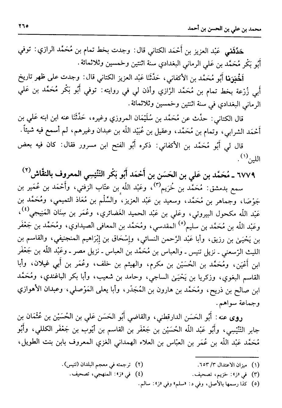 6779 - محمد بن علي بن الحسن بن أحمد أبو بكر التنيسي المعروف بالنقاش (2) سمع بدمشق محمد بن خريم (3) وعبد الله بن عتاب الزفتي وأحمد بن عمير بن جوصا وجماهر بن محمد وسعيد بن عبد العزيز والسلم بن معاذ التميمي ومحمد بن عبد الله مكحول البيروتي وعلي بن عبد الحميد الغضائري وعمر بن سنان المنيجي (4) وعبد الله بن محمد بن سليم (5) المقدسي ومحمد بن المعافى الصيداوي ومحمد بن جعفر بن يحيى بن رزيق وأبا عبد الرحمن النسائي وإسحاق بن إبراهيم المنجنيفي والقاسم بن الليث الرسعني نزيل تنيس والعباس بن محمد بن العباس نزيل مصر وعبد الله بن جعفر ابن أعين ومحمد بن الحسين بن مكرم والهيثم بن خلف وعمر بن أبي غيلان وأبا القاسم البغوي وزكريا بن يحيى الساجي وحامد بن شعيب وأبا بكر الباغندي ومحمد ابن صالح بن ذريح ومحمد بن هارون بن المجدر وأبا يعلى الموصلي وعبدان الأهوازي وجماعة سواهم روى عنه أبو الحسن الدارقطني والقاضي أبو الحسن علي بن الحسين بن عثمان بن جابر التنيسي وأبو عبد الله الحسين بن جعفر بن القاسم بن أيوب بن جعفر الكللي وأبو محمد عبد الله بن عمر بن العباس بن العلاء الهمداني الغزي المعروف بابن بنت الطويل