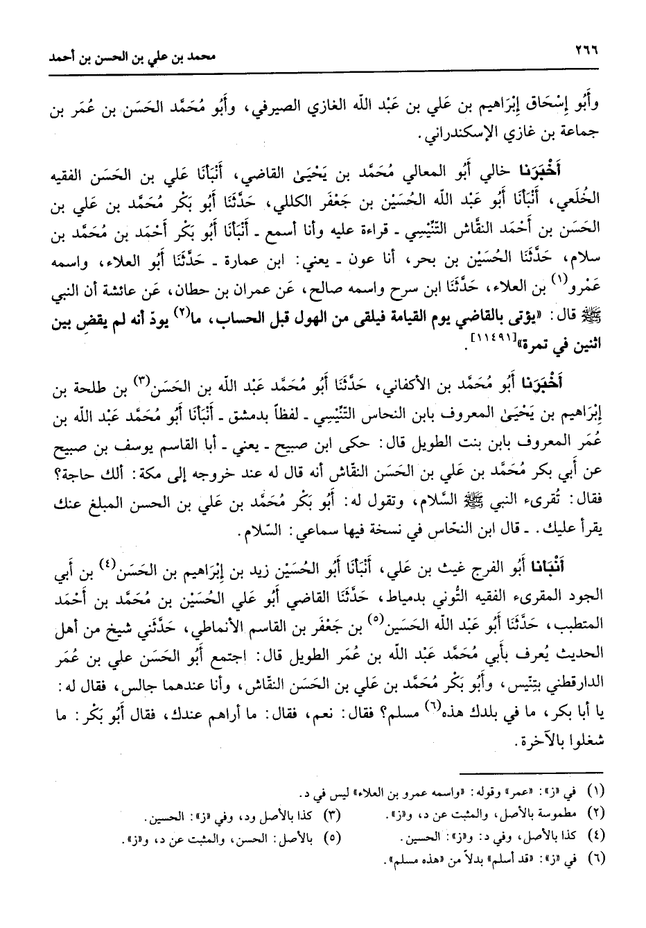 وأبو إسحاق إبراهيم بن علي بن عبد الله الغازي الصيرفي وأبو محمد الحسن بن عمر بن جماعة بن غازي الإسكندراني أخبرنا خالي أبو المعالي محمد بن يحيى القاضي أنبأنا علي بن الحسن الفقيه الخلعي أنبأنا أبو عبد الله الحسين بن جعفر الكللي حدثنا أبو بكر محمد بن علي بن الحسن بن أحمد النقاش التنيسي قراءة عليه وأنا أسمع أنبأنا أبو بكر أحمد بن محمد بن سلام حدثنا الحسين بن بحر أنا عون يعني ابن عمارة حدثنا أبو العلاء واسمه عمرو (1) بن العلاء حدثنا ابن سرح واسمه صالح عن عمران بن حطان عن عائشة أن النبي (صلى الله عليه وسلم) قال يؤتى بالقاضي يوم القيامة فيلقى من الهول قبل الحساب ما (2) يود أنه لم يقض بين اثنتين في تمرة