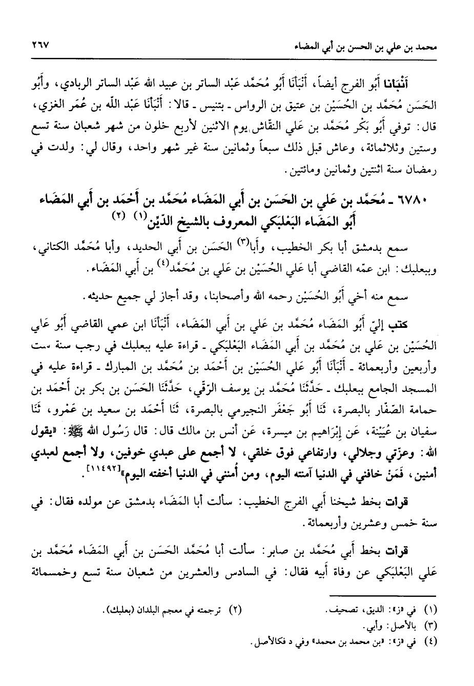 6780 - محمد بن علي بن الحسن بن أبي المضاء محمد بن أحمد بن أبي المضاء أبو المضاء البعلبكي المعروف بالشيخ الدين (1) (2) سمع بدمشق أبا بكر الخطيب وأبا (3) الحسن بن أبي الحديد وأبا محمد الكتاني وببعلبك ابن عمه القاضي ابا علي الحسين بن علي بن محمد (4) بن أبي المضاء سمع منه أخي أبو الحسين رحمه الله وأصحابنا وقد أجاز لي جميع حديثه كتب إلي أبو المضاء محمد بن علي بن أبي المضاء أنبأنا ابن عمي القاضي أبو علي الحسين بن علي بن محمد بن أبي المضاء البعلبكي قراءة عليه ببعلبك في رجب سنة ست وأربعين وأربعمائة أنبأنا أبو علي الحسين بن أحمد بن محمد بن المبارك قراءة عليه في المسجد الجامع ببعلبك حدثنا محمد بن يوسف الرقي حدثنا الحسن بن بكر بن أحمد بن حمامة الصفار بالبصرة ثنا أبو جعفر النجيرمي بالبصرة ثنا أحمد بن سعيد بن عمرو ثنا سفيان بن عيينة عن إبراهيم بن ميسرة عن أنس بن مالك قال قال رسول الله (صلى الله عليه وسلم) يقول الله وعزتي وجلالي وارتفاعي فوق خلقي لا أجمع على عبدي خوفين ولا أجمع لعبدي أمنين فمن خافني في الدنيا آمنته اليوم ومن أمنني في الدنيا أخفته اليوم