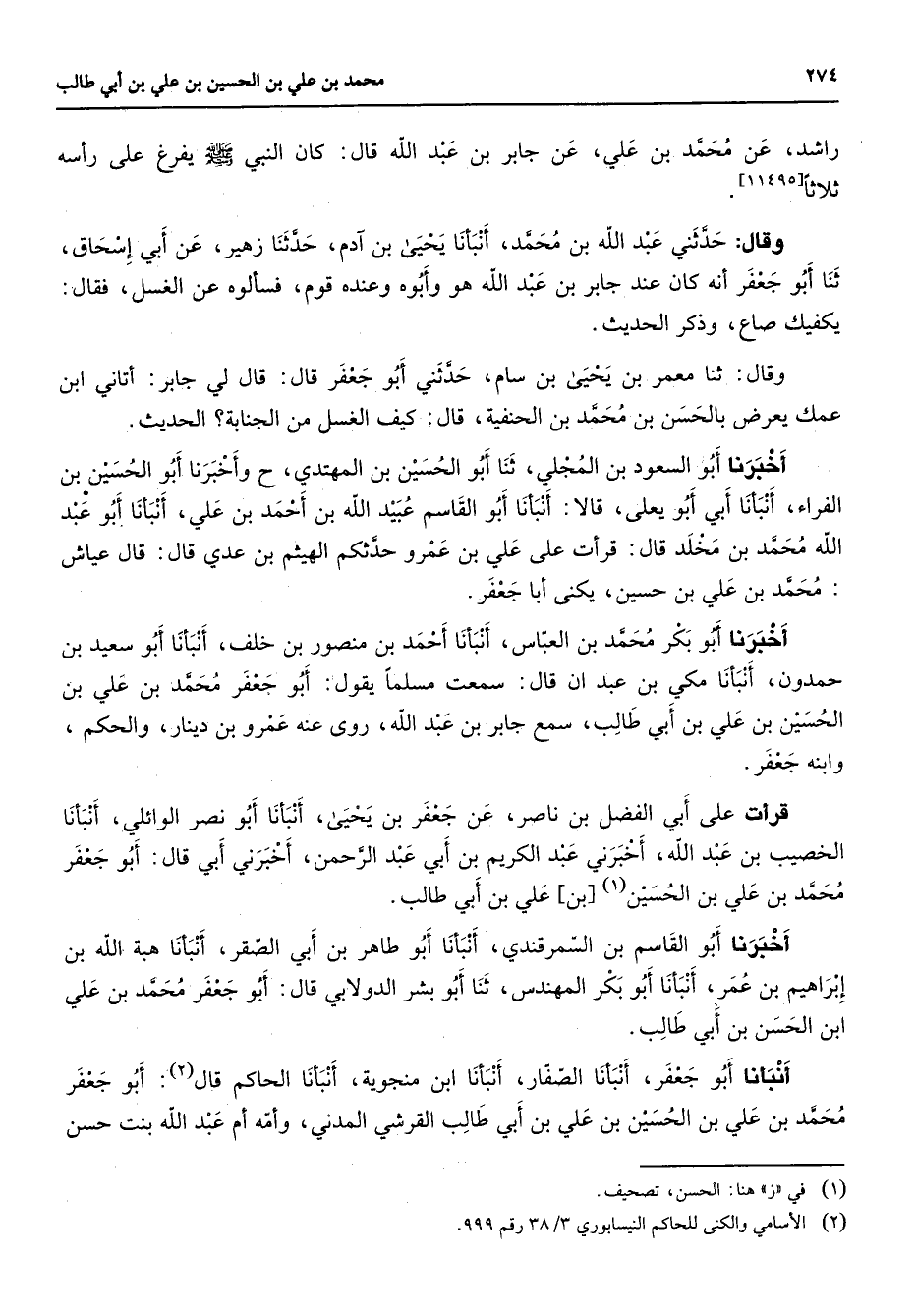 [11495] وقال حدثني عبد الله بن محمد أنبأنا يحيى بن آدم حدثنا زهير عن أبي إسحاق ثنا أبو جعفر أنه كان عند جابر بن عبد الله هو وأبوه وعنده قوم فسألوه عن الغسل فقال يكفيك صاع وذكر الحديث وقال ثنا معمر بن يحيى بن سام حدثني أبو جعفر قال قال لي جابر أتاني ابن عمك يعرض بالحسن بن محمد بن الحنفية قال كيف الغسل من الجنابة الحديث أخبرنا أبو السعود بن المجلي ثنا أبو الحسين بن المهتدي وأخبرنا أبو الحسين بن الفراء أنبأنا أبي أبو يعلى قالا أنبأنا أبو القاسم عبيد الله بن أحمد بن علي أنبأنا أبو عبد الله محمد بن مخلد قال قرأت على علي بن عمرو حدثكم الهيثم بن عدي قال قال عياش محمد بن علي بن حسين يكنى أبا جعفر أخبرنا أبو بكر محمد بن العباس أنبأنا أحمد بن منصور بن خلف أنبأنا أبو سعيد بن حمدون أنبأنا مكي بن عبدان قال سمعت مسلما يقول أبو جعفر محمد بن علي بن الحسين بن علي بن أبي طالب سمع جابر بن عبد الله روى عنه عمرو بن دينار والحكم وابنه جعفر قرأت على أبي الفضل بن ناصر عن جعفر بن يحيى أنبأنا أبو نصر الوائلي أنبأنا الخصيب بن عبد الله أخبرني عبد الكريم بن أبي عبد الرحمن أخبرني أبي قال أبو جعفر محمد بن علي بن الحسين (1) بن علي بن أبي طالب أخبرنا أبو القاسم بن السمرقندي أنبأنا أبو طاهر بن أبي الصقر أنبأنا هبة الله بن إبراهيم بن عمر أنبأنا أبو بكر المهندس ثنا أبو بشر الدولابي قال أبو جعفر محمد بن علي ابن الحسن بن أبي طالب أنبأنا أبو جعفر أنبأنا الصفار أنبأنا ابن منجوية أنبأنا الحاكم قال (2) أبو جعفر محمد بن علي بن الحسين بن علي بن أبي طالب القرشي المدني وأمه أم عبد الله بنت حسن