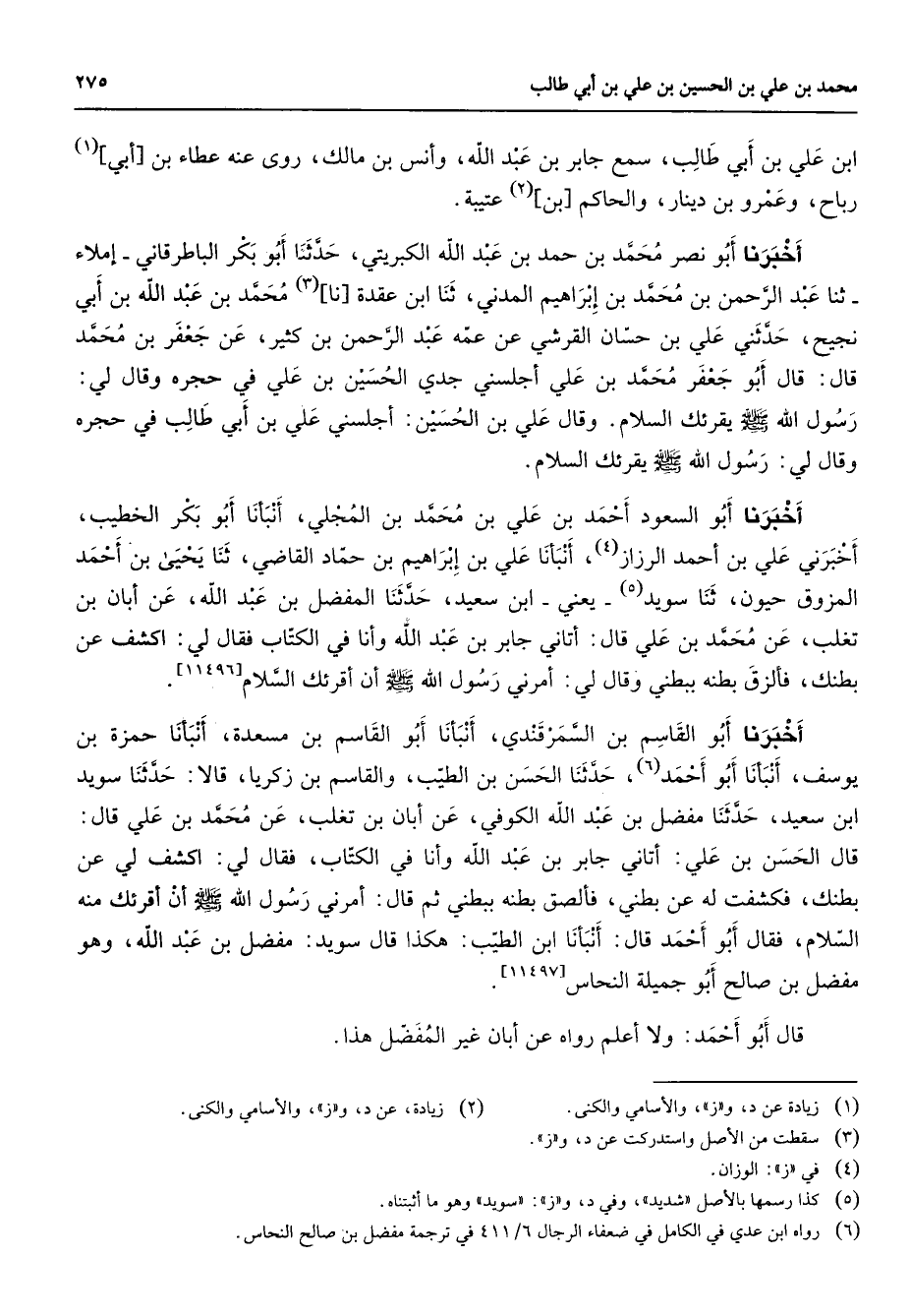 ابن علي بن أبي طالب سمع جابر بن عبد الله وأنس بن مالك روى عنه عطاء بن أبي (1) رباح وعمرو بن دينار والحاكم بن (2) عتيبة أخبرنا أبو نصر محمد بن حمد بن عبد الله الكبريتي حدثنا أبو بكر الباطرقاني إملاء ثنا عبد الرحمن بن محمد بن إبراهيم المدني ثنا ابن عقدة نا (3) محمد بن عبد الله بن أبي نجيح حدثني علي بن حسان القرشي عن عمه عبد الرحمن بن كثير عن جعفر بن محمد قال قال أبو جعفر محمد بن علي أجلسني جدي الحسين بن علي في حجره وقال لي رسول الله (صلى الله عليه وسلم) يقرئك السلام وقال علي بن الحسين أجلسني علي بن أبي طالب في حجره وقال لي رسول الله (صلى الله عليه وسلم) يقرئك السلام أخبرنا أبو السعود أحمد بن علي بن محمد بن المجلي أنبأنا أبو بكر الخطيب أخبرني علي بن أحمد الرزاز (4) أنبأنا علي بن إبراهيم بن حماد القاضي ثنا يحيى بن أحمد المزوق حيون ثنا سويد (5) يعني ابن سعيد حدثنا المفضل بن عبد الله عن أبان بن تغلب عن محمد بن علي قال أتاني جابر بن عبد الله وأنا في الكتاب فقال لي اكشف عن بطنك فألزق بطنه ببطني وقال لي أمرني رسول الله (صلى الله عليه وسلم) أن أقرئك السلام
