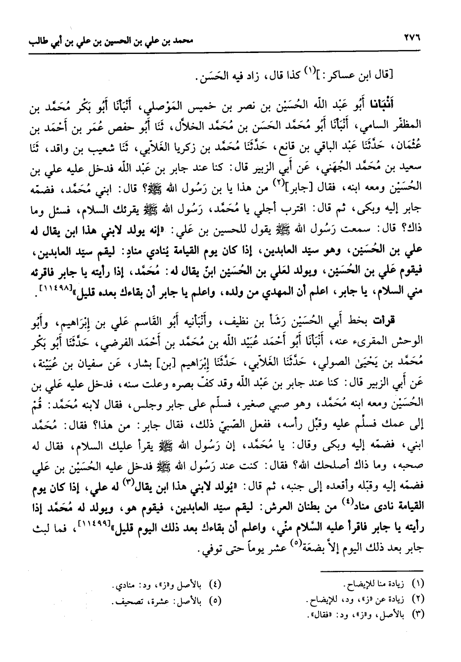 قال ابن عساكر (1) كذا قال زاد فيه الحسن أنبأنا أبو عبد الله الحسين بن نصر بن خميس الموصلي أنبأنا أبو بكر محمد بن المظفر السامي أنبأنا أبو محمد الحسن بن محمد الخلال ثنا أبو حفص عمر بن أحمد بن عثمان حدثنا عبد الباقي بن قانع حدثنا محمد بن زكريا الغلابي ثنا شعيب بن واقد ثنا سعيد بن محمد الجهني عن أبي الزبير قال كنا عند جابر بن عبد الله فدخل عليه علي بن الحسين ومعه ابنه فقال جابر (2) من هذا يا بن رسول الله (صلى الله عليه وسلم) قال ابني محمد فضمه جابر إليه وبكى ثم قال اقترب أجلي يا محمد رسول الله (صلى الله عليه وسلم) يقرئك السلام فسئل وما ذاك قال سمعت رسول الله (صلى الله عليه وسلم) يقول للحسين بن علي إنه يولد لابني هذا ابن يقال له علي بن الحسين وهو سيد العابدين إذا كان يوم القيامة ينادي مناد ليقم سيد العابدين فيقوم علي بن الحسين ويولد لعلي بن الحسين ابن يقال له محمد إذا رأيته يا جابر فاقرئه مني السلام يا جابر اعلم أن المهدي من ولده واعلم يا جابر أن بقاءك بعده قليل