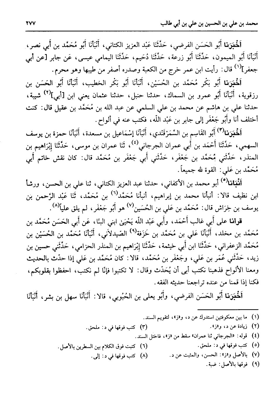 أخبرنا أبو الحسن الفرضي حدثنا عبد العزيز الكتاني أنبأنا أبو محمد بن أبي نصر أنبأنا أبو الميمون حدثنا أبو زرعة حدثنا دحيم حدثنا اليمامي عيسى عن جابر عن ابي جعفر (1) قال رأيت ابن عمر خرج من الكعبة وصدره أصفر من طيبها وهو محرم أخبرنا أبو بكر محمد بن الحسين أنبأنا أبو بكر الخطيب أنبأنا أبو الحسن بن رزقوية أنبأنا أبو عمرو بن السماك حدثنا حنبل حدثنا عثمان يعني ابن أبي (2) شيبة حدثنا علي بن هاشم عن محمد بن علي السلمي عن عبد الله بن محمد بن عقيل قال كنت أختلف أنا وأبو جعفر إلى جابر بن عبد الله فكتب عنه في ألواح أخبرنا (3) أبو القاسم بن السمرقندي أنبأنا إسماعيل بن مسعدة أنبأنا حمزة بن يوسف السهمي حدثنا أحمد بن أبي عمران الجرجاني (4) ثنا عمران بن موسى حدثنا إبراهيم بن المنذر حدثني محمد بن جعفر حدثني أبي جعفر بن محمد قال كان نقش خاتم أبي محمد بن علي القوة لله جميعا أنبأنا (5) أبو محمد بن الأكفاني حدثنا عبد العزيز الكتاني ثنا علي بن الحسن ورشأ ابن نظيف قالا أنبأنا محمد بن إبراهيم أنبأنا محمد (6) بن محمد ثنا عبد الرحمن بن يوسف بن خراش قال محمد بن علي بن الحسين (7) هو أبو جعفر لم يلق عليا (8) قرأنا على أبي غالب أحمد وأبي عبد الله يحيى ابني البنا عن أبي الحسن محمد بن محمد بن مخلد أنبأنا علي بن محمد بن خزفة (9) الصيدلاني أنبأنا محمد بن الحسين بن محمد الزعفراني حدثنا ابن أبي خيثمة حدثنا إبراهيم بن المنذر الحزامي حدثني حسين بن زيد حدثني عمر بن علي وجعفر بن محمد قالا كان محمد بن علي إذا حدث بالحديث ومعنا الألواح فذهبنا نكتب أبى أن يحدث وقال لا تكتبوا فإنا لم نكتب احفظوا بقلوبكم فكنا إذا قمنا من عنده تراجعنا حديثه الفقه أخبرنا أبو الحسن الفرضي وأبو يعلى بن الحبوبي قالا أنبأنا سهل بن بشر أنبأنا