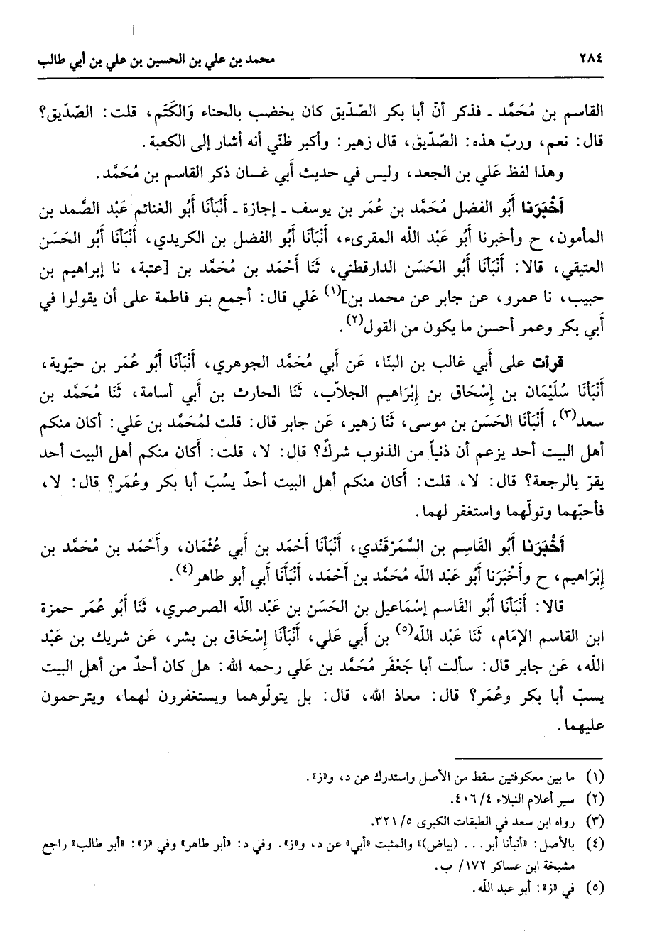 القاسم بن محمد فذكر أن أبا بكر الصديق كان يخضب بالحناء والكتم قلت الصديق قال نعم ورب هذه الصديق قال زهير وأكبر ظني أنه أشار إلى الكعبة وهذا لفظ علي بن الجعد وليس في حديث أبي غسان ذكر القاسم بن محمد أخبرنا أبو الفضل محمد بن عمر بن يوسف إجازة أنبأنا أبو الغنائم عبد الصمد بن المأمون وأخبرنا أبو عبد الله المقرئ أنبأنا أبو الفضل بن الكريدي أنبأنا أبو الحسن العتيقي قالا أنبأنا أبو الحسن الدارقطني ثنا أحمد بن محمد بن عتبة نا إبراهيم بن حبيب نا عمرو عن جابر عن محمد بن (1) علي قال أجمع بنو فاطمة على أن يقولوا في أبي بكر وعمر أحسن ما يكون من القول (2) قرأت على أبي غالب بن البنا عن أبي محمد الجوهري أنبأنا أبو عمر بن حيوية أنبأنا سليمان بن إسحاق بن إبراهيم الجلاب ثنا الحارث بن أبي أسامة ثنا محمد بن سعد (3) أنبأنا الحسن بن موسى ثنا زهير عن جابر قال قلت لمحمد بن علي أكان منكم أهل البيت أحد يزعم أن ذنبا من الذنوب شرك قال لا قلت أكان منكم أهل البيت أحد يقر بالرجعة قال لا قلت أكان منكم أهل البيت أحد يسب أبا بكر وعمر قال لا فأحبهما وتولهما واستغفر لهما أخبرنا أبو القاسم بن السمرقندي أنبأنا أحمد بن أبي عثمان وأحمد بن محمد بن إبراهيم وأخبرنا أبو عبد الله محمد بن أحمد أنبأنا أبي أبو طاهر (4) قالا أنبأنا أبو القاسم إسماعيل بن الحسن بن عبد الله الصرصري ثنا أبو عمر حمزة ابن القاسم الإمام ثنا عبد الله (5) بن أبي علي أنبأنا إسحاق بن بشر عن شريك بن عبد الله عن جابر قال سألت أبا جعفر محمد بن علي رحمه الله هل كان أحد من أهل البيت يسب أبا بكر وعمر قال معاذ الله قال بل يتولوهما ويستغفرون لهما ويترحمون عليهما