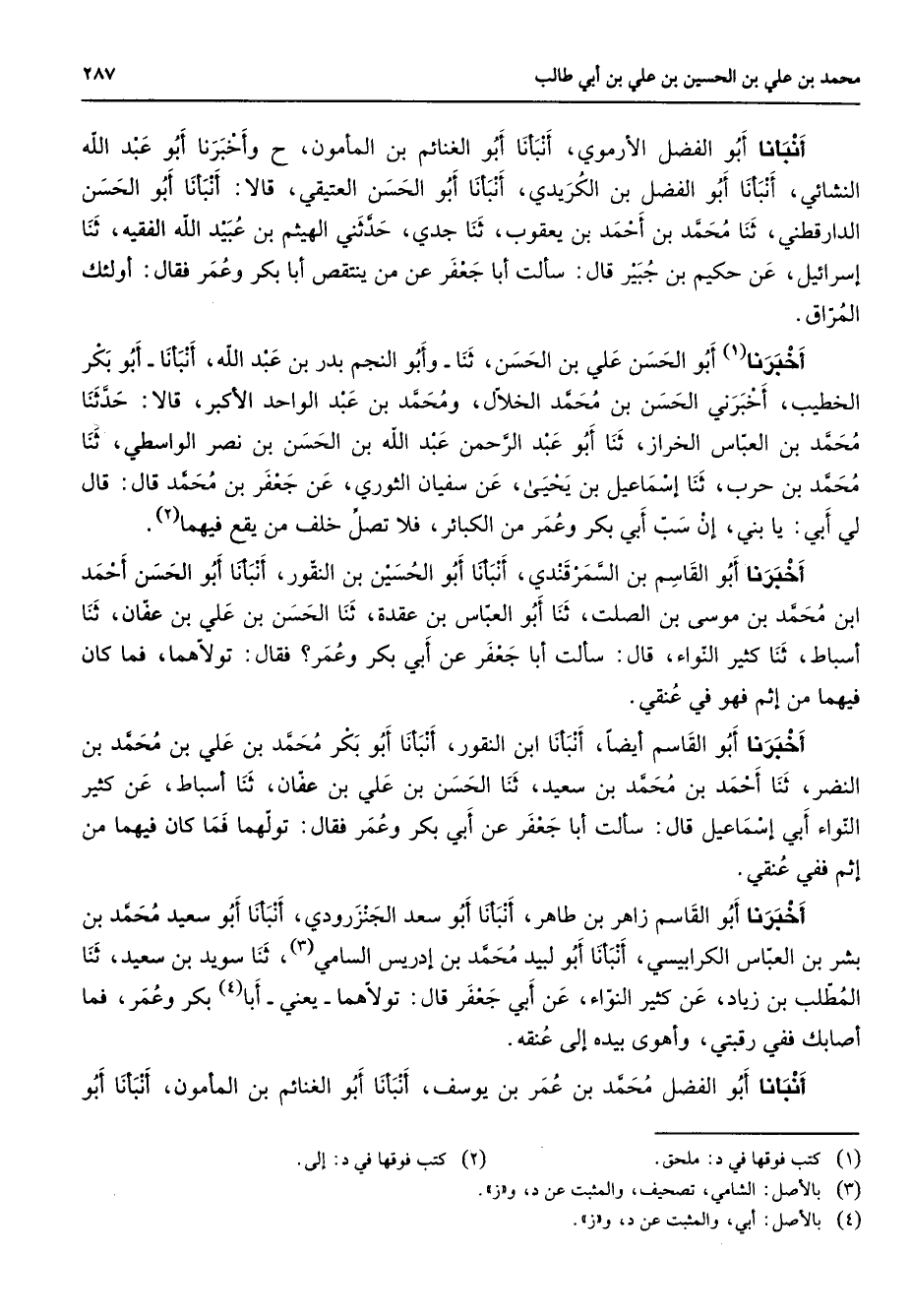 أنبأنا أبو الفضل الأرموي أنبأنا أبو الغنائم بن المأمون وأخبرنا أبو عبد الله النشائي أنبأنا أبو الفضل بن الكريدي أنبأنا أبو الحسن العتيقي قالا أنبأنا أبو الحسن الدارقطني ثنا محمد بن أحمد بن يعقوب ثنا جدي حدثني الهيثم بن عبيد الله الفقيه ثنا إسرائيل عن حكيم بن جبير قال سألت أبا جعفر عن من ينتقص أبا بكر وعمر فقال أولئك المراق أخبرنا (1) أبو الحسن علي بن الحسن ثنا وأبو النجم بدر بن عبد الله أنبأنا أبو بكر الخطيب أخبرني الحسن بن محمد الخلال ومحمد بن عبد الواحد الأكبر قالا حدثنا محمد بن العباس الخراز ثنا أبو عبد الرحمن عبد الله بن الحسن بن نصر الواسطي ثنا محمد بن حرب ثنا إسماعيل بن يحيى عن سفيان الثوري عن جعفر بن محمد قال قال لي أبي يا بني إن سب أبي بكر وعمر من الكبائر فلا تصل خلف من يقع فيهما (2) أخبرنا أبو القاسم بن السمرقندي أنبأنا أبو الحسين بن النقور أنبأنا أبو الحسن أحمد ابن محمد بن موسى بن الصلت ثنا أبو العباس بن عقدة ثنا الحسن بن علي بن عفان ثنا أسباط ثنا كثير النواء قال سألت أبا جعفر عن أبي بكر وعمر فقال تولاهما فما كان فيهما من إثم فهو في عنقي أخبرنا أبو القاسم أيضا أنبأنا ابن النقور أنبأنا أبو بكر محمد بن علي بن محمد بن النضر ثنا أحمد بن محمد بن سعيد ثنا الحسن بن علي بن عفان ثنا أسباط عن كثير النواء أبي إسماعيل قال سألت أبا جعفر عن أبي بكر وعمر فقال تولهما فما كان فيهما من إثم ففي عنقي أخبرنا أبو القاسم زاهر بن طاهر أنبأنا أبو سعد الجنزرودي أنبأنا أبو سعيد محمد بن بشر بن العباس الكرابيسي أنبأنا أبو لبيد محمد بن إدريس السامي (3) ثنا سويد بن سعيد ثنا المطلب بن زياد عن كثير النواء عن أبي جعفر قال تولاهما يعني أبا (4) بكر وعمر فما أصابك ففي رقبتي وأهوى بيده إلى عنقه أنبأنا أبو الفضل محمد بن عمر بن يوسف أنبأنا أبو الغنائم بن المأمون أنبأنا أبو