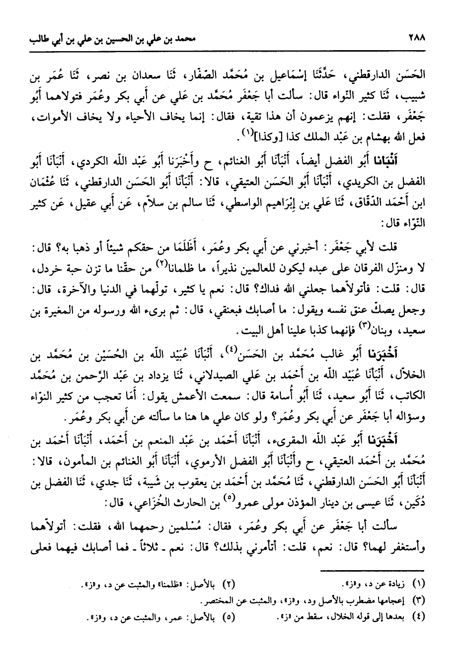 الحسن الدارقطني حدثنا إسماعيل بن محمد الصفار ثنا سعدان بن نصر ثنا عمر بن شبيب ثنا كثير النواء قال سألت أبا جعفر محمد بن علي عن أبي بكر وعمر فتولاهما أبو جعفر فقلت إنهم يزعمون أن هذا تقية فقال إنما يخاف الأحياء ولا يخاف الأموات فعل الله بهشام بن عبد الملك كذا وكذا (1) أنبأنا أبو الفضل أيضا أنبأنا أبو الغنائم وأخبرنا أبو عبد الله الكردي أنبأنا أبو الفضل بن الكريدي أنبأنا أبو الحسن العتيقي قالا أنبأنا أبو الحسن الدارقطني ثنا عثمان ابن أحمد الدقاق ثنا علي بن إبراهيم الواسطي ثنا سالم بن سلام عن أبي عقيل عن كثير النواء قال قلت لأبي جعفر أخبرني عن أبي بكر وعمر أظلما من حقكم شيئا أو ذهبا به قال لا ومنزل الفرقان على عبده ليكون للعالمين نذيرا ما ظلمانا (2) من حقنا ما تزن حبة خردل قال قلت فأتولاهما جعلني الله فداك قال نعم يا كثير تولهما في الدنيا والآخرة قال وجعل يصك عنق نفسه ويقول ما أصابك فبعنقي قال ثم برئ الله ورسوله من المغيرة بن سعيد وبنان (3) فإنهما كذبا علينا أهل البيت أخبرنا أبو غالب محمد بن الحسن (4) أنبأنا عبيد الله بن الحسين بن محمد بن الخلال أنبأنا عبيد الله بن أحمد بن علي الصيدلاني ثنا يزداد بن عبد الرحمن بن محمد الكاتب ثنا أبو سعيد ثنا أبو أسامة قال سمعت الأعمش يقول أما تعجب من كثير النواء وسؤاله أبا جعفر عن أبي بكر وعمر ولو كان علي هاهنا ما سألته عن أبي بكر وعمر أخبرنا أبو عبد الله المقرئ أنبأنا أحمد بن عبد المنعم بن أحمد أنبأنا أحمد بن محمد بن أحمد العتيقي وأنبأنا أبو الفضل الأرموي أنبأنا أبو الغنائم بن المأمون قالا أنبأنا أبو الحسن الدارقطني ثنا محمد بن أحمد بن يعقوب بن شيبة ثنا جدي ثنا الفضل بن دكين ثنا عيسى بن دينار المؤذن مولى عمرو (5) بن الحارث الخزاعي قال سألت أبا جعفر عن أبي بكر وعمر فقال مسلمين رحمهما الله فقلت أتولاهما وأستغفر لهما قال نعم قلت أتأمرني بذلك قال نعم ثلاثا فما أصابك فيهما فعلى