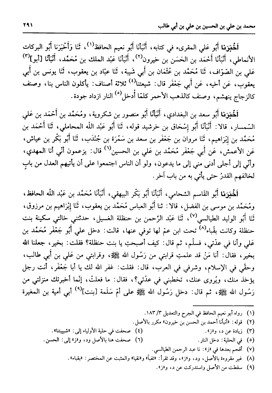 أخبرنا أبو علي المقرئ في كتابه أنبأنا أبو نعيم الحافظ (1) ثنا وأخبرنا أبو البركات الأنماطي أنبأنا أحمد بن الحسن بن خيرون (2) أنبأنا عبد الملك بن محمد أنبأنا أبو (3) علي بن الصواف ثنا محمد بن عثمان بن أبي شيبة ثنا عباد بن يعقوب ثنا يونس بن أبي يعقوب عن أخيه عن أبي جعفر قال شيعتنا (4) ثلاثة أصناف يأكلون الناس بنا وصنف كالزجاج ينهشم وصنف كالذهب الأحمر كلما أدخل (5) النار ازداد جودة أخبرنا أبو سعد بن البغدادي أنبأنا أبو منصور بن شكروية ومحمد بن أحمد بن علي السمسار قالا أنبأنا أبو إسحاق بن خرشيد قوله ثنا أبو عبد الله المحاملي ثنا أحمد بن محمد بن إبراهيم ثنا مروان بن جعفر بن سعد بن سمرة بن جندب ثنا أبو بكر بن عياش عن الأعمش عن أبي جعفر محمد بن علي بن الحسين (6) قال يزعمون أني أنا المهدي وأني إلى أجلى أدنى مني إلى ما يدعون ولو أن الناس اجتمعوا على أن يأتيهم العدل من باب لخالفهم القدر حتى يأتي به من باب آخر أخبرنا أبو القاسم الشحامي أنبأنا أبو بكر البيهقي أنبأنا محمد بن عبد الله الحافظ ومحمد بن موسى بن الفضل قالا ثنا أبو العباس محمد بن يعقوب ثنا إبراهيم بن مرزوق ثنا أبو الوليد الطيالسي (7) ثنا عبد الرحمن بن حنظلة الغسيل حدثتني خالتي سكينة بنت حنظلة وكانت بقباء (8) تحت ابن عم لها توفي عنها قالت دخل علي أبو جعفر محمد بن علي وأنا في عدتي فسلم ثم قال كيف أصبحت يا بنت حنظلة فقلت بخير جعلنا الله بخير فقال أنا من قد علمت قرابتي من رسول الله (صلى الله عليه وسلم) وقرابتي من علي بن أبي طالب وحقي في الإسلام وشرفي في العرب قال فقلت غفر الله لك يا أبا جعفر أنت رجل يؤخذ منك ويروى عنك تخطبني في عدتي فقال ما فعلت إنما أخبرتك منزلتي من رسول الله (صلى الله عليه وسلم) ثم قال دخل رسول الله (صلى الله عليه وسلم) على أم سلمة بنت (9) أبي أمية بن المغيرة