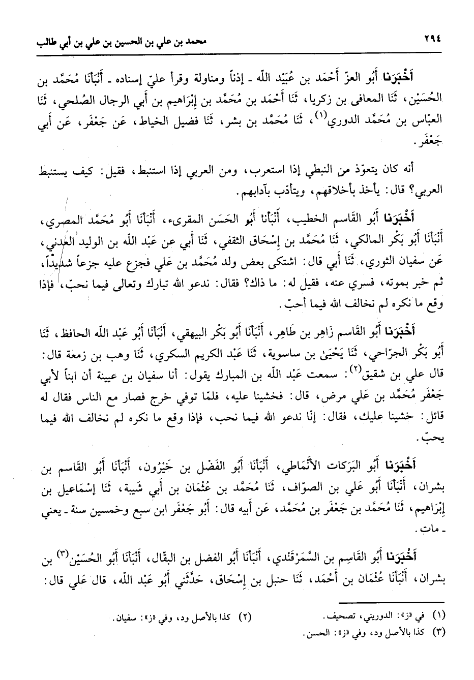 أخبرنا أبو العز أحمد بن عبيد الله إذنا ومناولة وقرأ علي إسناده أنبأنا محمد بن الحسين ثنا المعافى بن زكريا ثنا أحمد بن محمد بن إبراهيم بن أبي الرجال الصلحي ثنا العباس بن محمد الدوري (1) ثنا محمد بن بشر ثنا فضيل الخياط عن جعفر عن أبي جعفر أنه كان يتعوذ من النبطي إذا استعرب ومن العربي إذا استنبط فقيل كيف يستنبط العربي قال يأخذ بأخلاقهم ويتأدب بآدابهم أخبرنا أبو القاسم الخطيب أنبأنا أبو الحسن المقرئ أنبأنا أبو محمد المصري أنبأنا أبو بكر المالكي ثنا محمد بن إسحاق الثقفي ثنا أبي عن عبد الله بن الوليد العدني عن سفيان الثوري ثنا أبي قال اشتكى بعض ولد محمد بن علي فجزع عليه جزعا شديدا ثم خبر بموته فسري عنه فقيل له ما ذاك فقال ندعو الله تبارك وتعالى فيما نحب فإذا وقع ما نكره لم نخالف الله فيما أحب أخبرنا أبو القاسم زاهر بن طاهر أنبأنا أبو بكر البيهقي أنبأنا أبو عبد الله الحافظ ثنا أبو بكر الجراحي ثنا يحيى بن ساسوية ثنا عبد الكريم السكري ثنا وهب بن زمعة قال قال علي بن شقيق (2) سمعت عبد الله بن المبارك يقول أنا سفيان بن عيينة أن ابنا لأبي جعفر محمد بن علي مرض قال فخشينا عليه فلما توفي خرج فصار مع الناس فقال له قائل خشينا عليك فقال إنا ندعو الله فيما نحب فإذا وقع ما نكره لم نخالف الله فيما يحب أخبرنا أبو البركات الأنماطي أنبأنا أبو الفضل بن خيرون أنبأنا أبو القاسم بن بشران أنبأنا أبو علي بن الصواف ثنا محمد بن عثمان بن أبي شيبة ثنا إسماعيل بن إبراهيم ثنا محمد بن جعفر بن محمد عن أبيه قال أبو جعفر ابن سبع وخمسين سنة يعني مات أخبرنا أبو القاسم بن السمرقندي أنبأنا أبو الفضل بن البقال أنبأنا أبو الحسين (3) بن بشران أنبأنا عثمان بن أحمد ثنا حنبل بن إسحاق حدثني أبو عبد الله قال علي قال