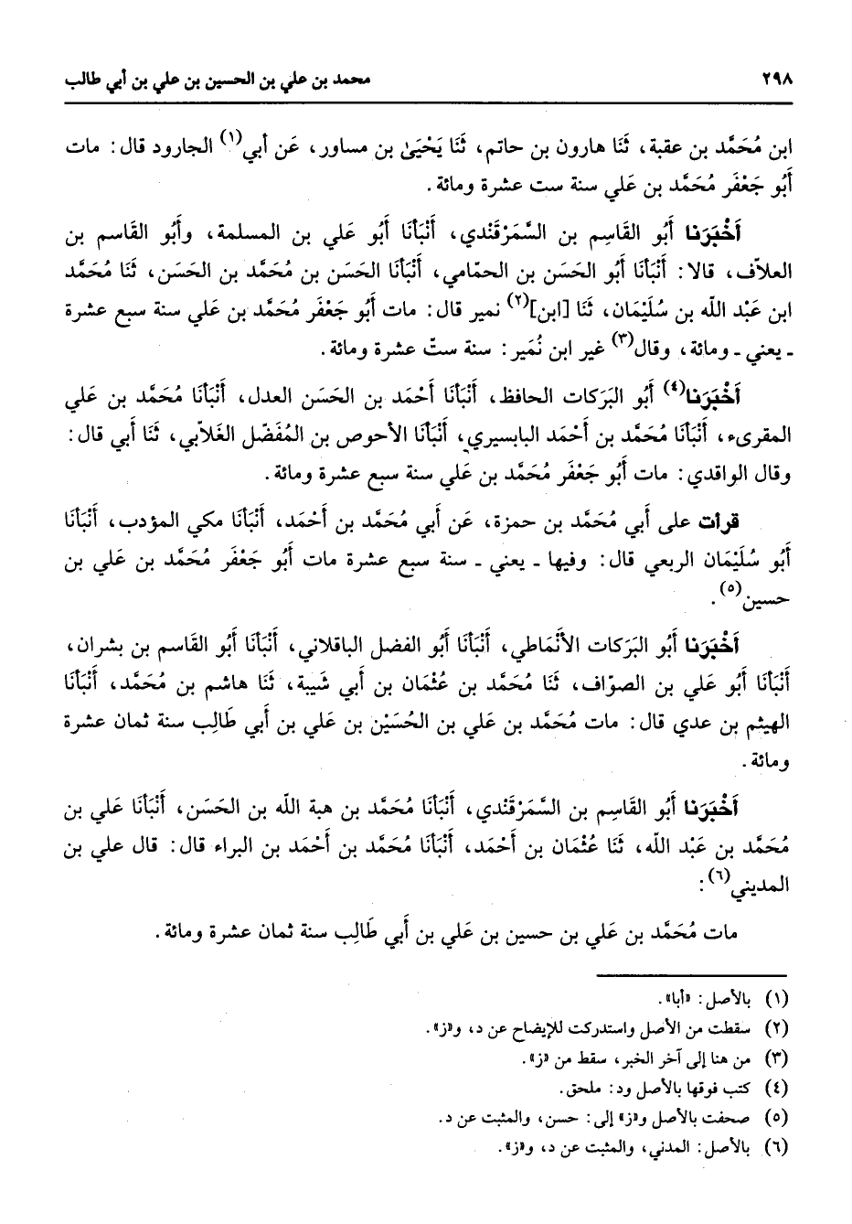 ابن محمد بن عقبة ثنا هارون بن حاتم ثنا يحيى بن مساور عن أبي (1) الجارود قال مات أبو جعفر محمد بن علي سنة ست عشرة ومائة أخبرنا أبو القاسم بن السمرقندي أنبأنا أبو علي بن المسلمة وأبو القاسم بن العلاف قالا أنبأنا أبو الحسن بن الحمامي أنبأنا الحسن بن محمد بن الحسن ثنا محمد ابن عبد الله بن سليمان ثنا ابن (2) نمير قال مات أبو جعفر محمد بن علي سنة سبع عشرة يعني ومائة وقال (3) غير ابن نمير سنة ست عشرة ومائة أخبرنا (4) أبو البركات الحافظ أنبأنا أحمد بن الحسن العدل أنبأنا محمد بن علي المقرئ أنبأنا محمد بن أحمد البابسيري أنبأنا الأحوص بن المفضل الغلابي ثنا أبي قال وقال الواقدي مات أبو جعفر محمد بن علي سنة سبع عشرة ومائة قرأت على أبي محمد بن حمزة عن أبي محمد بن أحمد أنبأنا مكي المؤدب أنبأنا أبو سليمان الربعي قال وفيها يعني سنة سبع عشرة مات أبو جعفر محمد بن علي بن حسين (5) أخبرنا أبو البركات الأنماطي أنبأنا أبو الفضل الباقلاني أنبأنا أبو القاسم بن بشران أنبأنا أبو علي بن الصواف ثنا محمد بن عثمان بن أبي شيبة ثنا هاشم بن محمد أنبأنا الهيثم بن عدي قال مات محمد بن علي بن الحسين بن علي بن أبي طالب سنة ثمان عشرة ومائة أخبرنا أبو القاسم بن السمرقندي أنبأنا محمد بن هبة الله بن الحسن أنبأنا علي بن محمد بن عبد الله ثنا عثمان بن أحمد أنبأنا محمد بن أحمد بن البراء قال قال علي بن المديني (6) مات محمد بن علي بن حسين بن علي بن أبي طالب سنة ثمان عشرة ومائة
