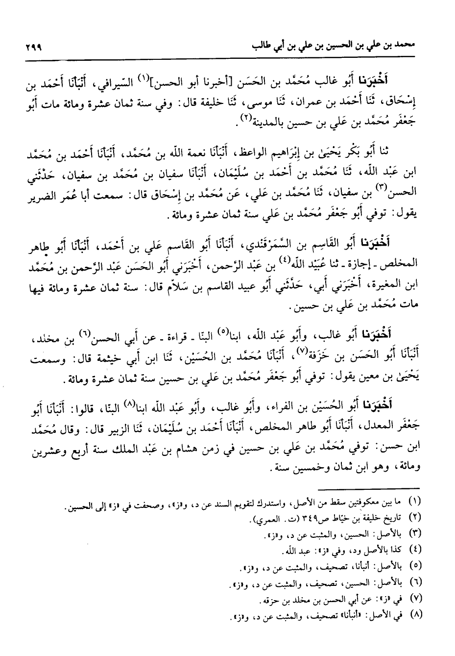 أخبرنا أبو غالب محمد بن الحسن أخبرنا أبو الحسن (1) السيرافي أنبأنا أحمد بن إسحاق ثنا أحمد بن عمران ثنا موسى ثنا خليفة قال وفي سنة ثمان عشرة ومائة مات أبو جعفر محمد بن علي بن حسين بالمدينة (2) ثنا أبو بكر يحيى بن إبراهيم الواعظ أنبأنا نعمة الله بن محمد أنبأنا أحمد بن محمد ابن عبد الله ثنا محمد بن أحمد بن سليمان أنبأنا سفيان بن محمد بن سفيان حدثني الحسن (3) بن سفيان ثنا محمد بن علي عن محمد بن إسحاق قال سمعت أبا عمر الضرير يقول توفي أبو جعفر محمد بن علي سنة ثمان عشرة ومائة أخبرنا أبو القاسم بن السمرقندي أنبأنا أبو القاسم علي بن أحمد أنبأنا أبو طاهر المخلص إجازة ثنا عبيد الله (4) بن عبد الرحمن أخبرني أبو الحسن عبد الرحمن بن محمد ابن المغيرة أخبرني أبي حدثني أبو عبيد القاسم بن سلام قال سنة ثمان عشرة ومائة فيها مات محمد بن علي بن حسين أخبرنا أبو غالب وأبو عبد الله ابنا (5) البنا قراءة عن أبي الحسن (6) بن مخلد أنبأنا أبو الحسن بن خزفة (7) أنبأنا محمد بن الحسين ثنا ابن أبي خيثمة قال وسمعت يحيى بن معين يقول توفي أبو جعفر محمد بن علي بن حسين سنة ثمان عشرة ومائة أخبرنا أبو الحسين بن الفراء وأبو غالب وأبو عبد الله ابنا (8) البنا قالوا أنبأنا أبو جعفر المعدل أنبأنا أبو طاهر المخلص أنبأنا أحمد بن سليمان ثنا الزبير قال وقال محمد ابن حسن توفي محمد بن علي بن حسين في زمن هشام بن عبد الملك سنة أربع وعشرين ومائة وهو ابن ثمان وخمسين سنة