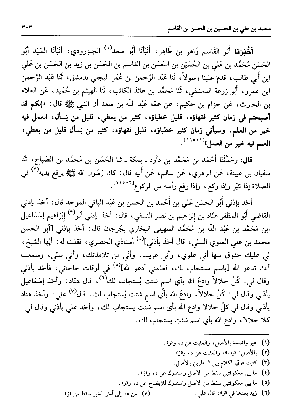 أخبرنا أبو القاسم زاهر بن طاهر أنبأنا أبو سعد (1) الجنزرودي أنبأنا السيد أبو الحسن محمد بن علي بن الحسين بن الحسن بن القاسم بن الحسن بن زيد بن الحسن بن علي ابن أبي طالب قدم علينا رسولا ثنا عبد الرحمن بن عمر البجلي بدمشق ثنا عبد الرحمن ابن عمرو أبو زرعة الدمشقي ثنا محمد بن عائذ الكاتب ثنا الهيثم بن حميد عن العلاء بن الحارث عن حزام بن حكيم عن عمه عبد الله بن سعد أن النبي (صلى الله عليه وسلم) قال إنكم قد أصبحتم زمان كثير فقهاؤه قليل خطباؤه كثير من يعطي قليل من يسأل العمل فيه خير من العلم وسيأتي زمان كثير خطباؤه قليل فقهاؤه كثير من يسأل قليل من يعطي العلم فيه خير من العلم