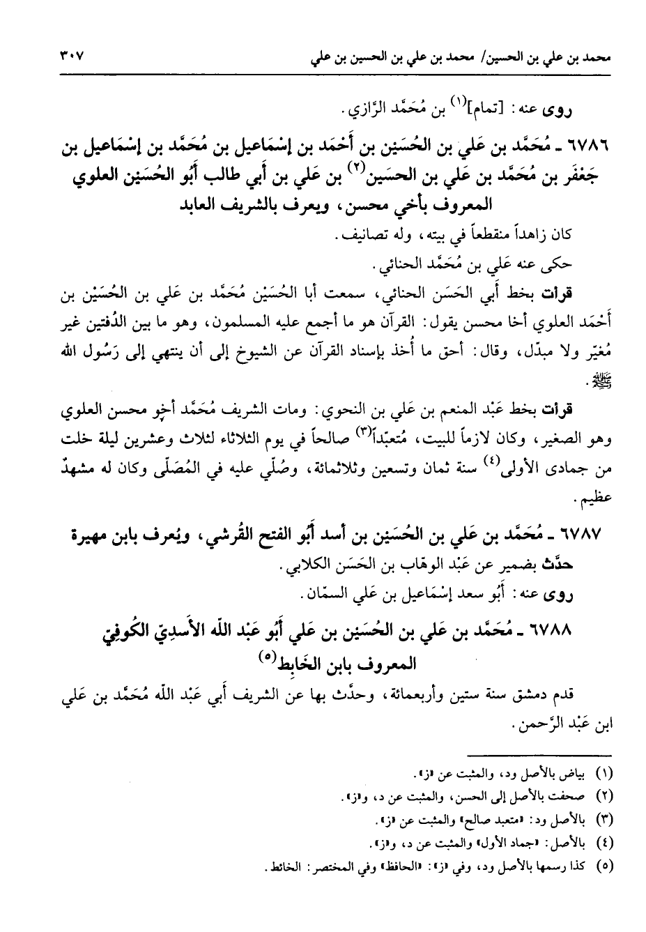 6786 - محمد بن علي بن الحسين بن أحمد بن إسماعيل بن محمد بن إسماعيل بن جعفر بن محمد بن علي بن الحسين (2) بن علي بن أبي طالب أبو الحسين العلوي المعروف بأخي محسن ويعرف بالشريف العابد كان زاهدا منقطعا في بيته وله تصانيف حكى عنه علي بن محمد الحنائي قرأت بخط أبي الحسن الحنائي سمعت أبا الحسين محمد بن علي بن الحسين بن أحمد العلوي أخا محسن يقول القرآن هو ما أجمع عليه المسلمون وهو ما بين الدفتين غير مغير ولا مبدل وقال أحق ما أخذ بإسناد القرآن عن الشيوخ إلى أن ينتهي إلى رسول الله (صلى الله عليه وسلم) قرأت بخط عبد المنعم بن علي بن النحوي ومات الشريف محمد أخو محسن العلوي وهو الصغير وكان لازما للبيت متعبدا (3) صالحا في يوم الثلاثاء لثلاث وعشرين ليلة خلت من جمادى الأولى (4) سنة ثمان وتسعين وثلاثمائة وصلي عليه في المصلى وكان له مشهد عظيم