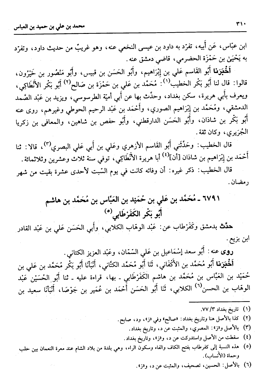 6791 - محمد بن علي بن حميد بن العباس بن محمد بن هاشم أبو بكر الكفرطابي (5) حدث بدمشق وكفر طاب عن عبد الوهاب الكلابي وأبي الحسن علي بن عبد القادر ابن بزيع روى عنه أبو سعد إسماعيل بن علي السمان وعبد العزيز الكتاني أخبرنا أبو محمد بن الأكفاني ثنا أبو محمد الكتاني أنبأنا أبو بكر محمد بن علي بن حميد بن العباس بن محمد بن هاشم الكفرطابي بها قراءة عليه ثنا أبو الحسين عبد الوهاب بن الحسن (6) الكلابي ثنا أبو الحسن أحمد بن عمير بن جوصا أنبأنا سعيد بن