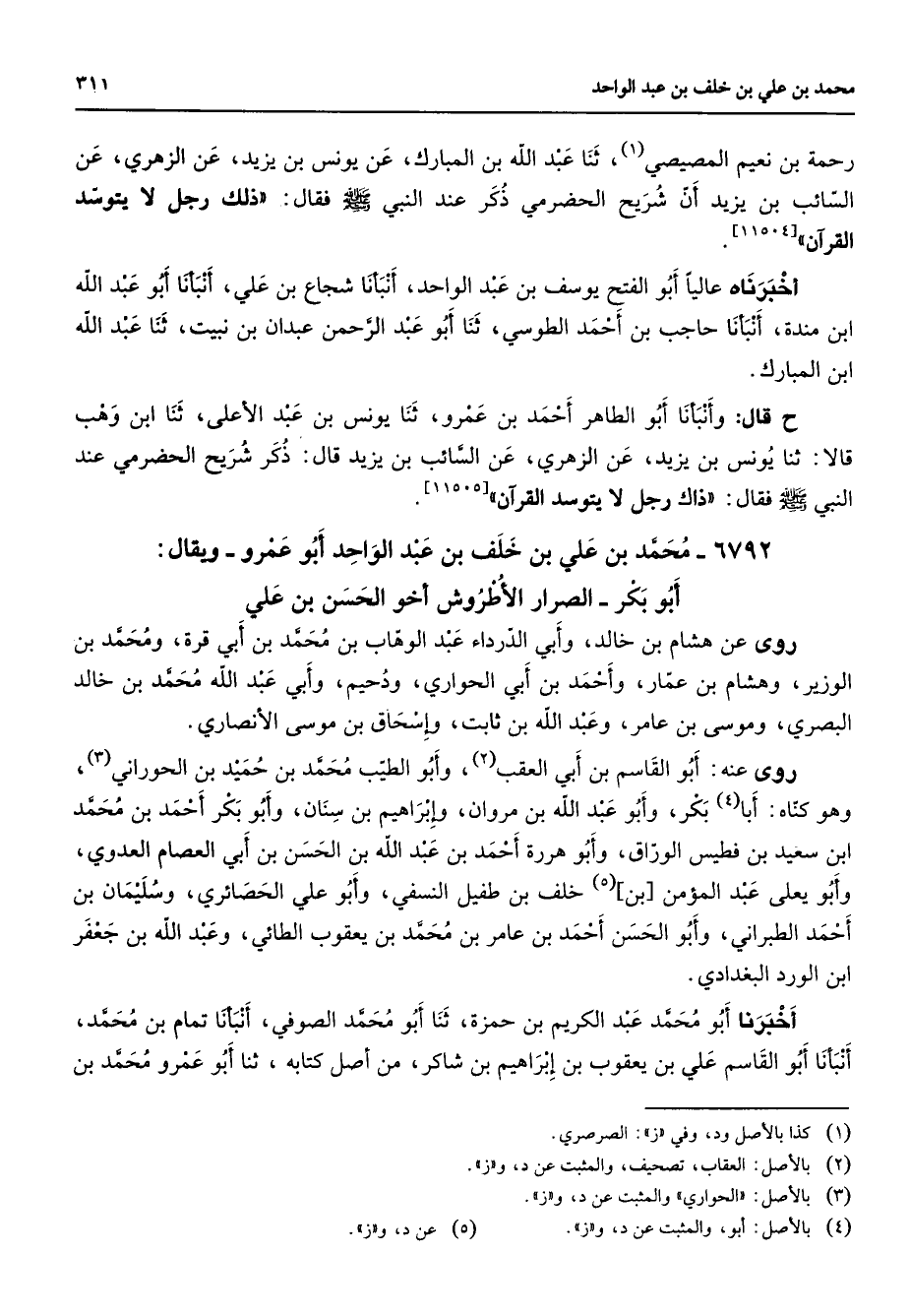 [11504] أخبرناه عاليا أبو الفتح يوسف بن عبد الواحد أنبأنا شجاع بن علي أنبأنا أبو عبد الله ابن مندة أنبأنا حاجب بن أحمد الطوسي ثنا أبو عبد الرحمن عبدان بن نبيت ثنا عبد الله ابن المبارك ح قال وأنبأنا أبو الطاهر أحمد بن عمرو ثنا يونس بن عبد الأعلى ثنا ابن وهب قالا ثنا يونس بن يزيد عن الزهري عن السائب بن يزيد قال ذكر شريح الحضرمي عند النبي (صلى الله عليه وسلم) فقال ذاك رجل لا يتوسد القرآن