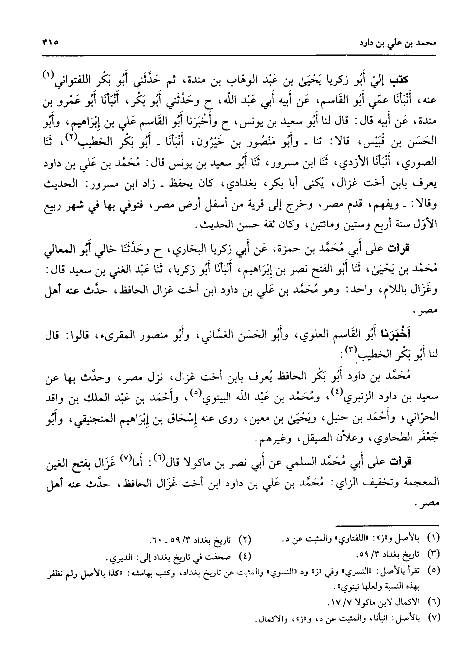 كتب إلي أبو زكريا يحيى بن عبد الوهاب بن مندة ثم حدثني أبو بكر اللفتواني (1) عنه أنبأنا عمي أبو القاسم عن أبيه أبي عبد الله وحدثني أبو بكر أنبأنا أبو عمرو بن مندة عن أبيه قال قال لنا أبو سعيد بن يونس وأخبرنا أبو القاسم علي بن إبراهيم وأبو الحسن بن قبيس قالا ثنا وأبو منصور بن خيرون أنبأنا أبو بكر الخطيب (2) ثنا الصوري أنبأنا الأزدي ثنا ابن مسرور ثنا أبو سعيد بن يونس قال محمد بن علي بن داود يعرف بابن أخت غزال يكنى أبا بكر بغدادي كان يحفظ زاد ابن مسرور الحديث وقالا ويفهم قدم مصر وخرج إلى قرية من أسفل أرض مصر فتوفي بها في شهر ربيع الأول سنة أربع وستين ومائتين وكان ثقة حسن الحديث قرأت على أبي محمد بن حمزة عن أبي زكريا البخاري وحدثنا خالي أبو المعالي محمد بن يحيى ثنا أبو الفتح نصر بن إبراهيم أنبأنا أبو زكريا ثنا عبد الغني بن سعيد قال وغزال باللام واحد وهو محمد بن علي بن داود بن أخت غزال الحافظ حدث عنه أهل مصر أخبرنا أبو القاسم العلوي وأبو الحسن الغساني وأبو منصور المقرئ قالوا قال لنا أبو بكر الخطيب (3) محمد بن داود أبو بكر الحافظ يعرف بابن أخت غزال نزل مصر وحدث بها عن سعيد بن داود الزنبري (4) ومحمد بن عبد الله البينوي (5) وأحمد بن عبد الملك بن واقد الحراني وأحمد بن حنبل ويحيى بن معين روى عنه إسحاق بن إبراهيم المنجنيقي وأبو جعفر الطحاوي وعلان الصيقل وغيرهم قرأت على أبي محمد السلمي عن أبي نصر بن ماكولا قال أما غزال بفتح الغين المعجمة وتخفيف الزاي محمد بن علي بن داود ابن أخت غزال الحافظ حدث عنه أهل مصر