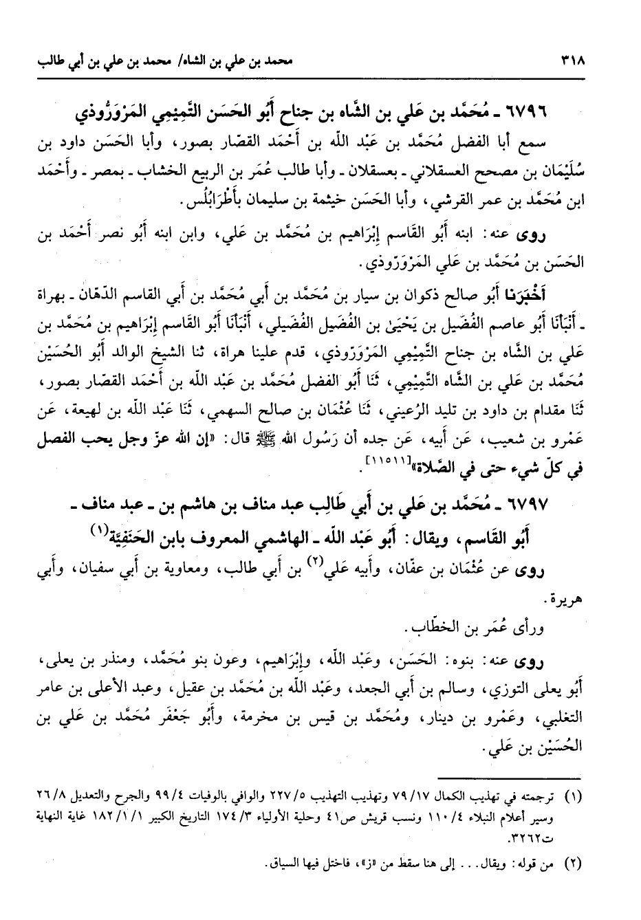 6796 - محمد بن علي بن الشاه بن جناح أبو الحسن التميمي المروروذي سمع أبا الفضل محمد بن عبد الله بن أحمد القصار بصور وأبا الحسن داود بن سليمان بن مصحح العسقلاني بعسقلان وأبا طالب عمر بن الربيع الخشاب بمصر وأحمد ابن محمد بن عمر القرشي وأبا الحسن خيثمة بن سليمان بأطرابلس روى عنه ابنه أبو القاسم إبراهيم بن محمد بن علي وابن ابنه أبو نصر أحمد بن الحسن بن محمد بن علي المروروذي أخبرنا أبو صالح ذكوان بن سيار بن محمد بن أبي محمد بن أبي القاسم الدهان بهراة أنبأنا أبو عاصم الفضيل بن يحيى بن الفضيل الفضيلي أنبأنا أبو القاسم إبراهيم بن محمد بن علي بن الشاه بن جناح التميمي المروروذي قدم علينا هراة ثنا الشيخ الوالد أبو الحسين محمد بن علي بن الشاه التميمي ثنا أبو الفضل محمد بن عبد الله بن أحمد القصار بصور ثنا مقدام بن داود بن تليد الرعيني ثنا عثمان بن صالح السهمي ثنا عبد الله بن لهيعة عن عمرو بن شعيب عن أبيه عن جده أن رسول الله (صلى الله عليه وسلم) قال إن الله عز وجل يحب الفصل في كل شئ حتى في الصلاة