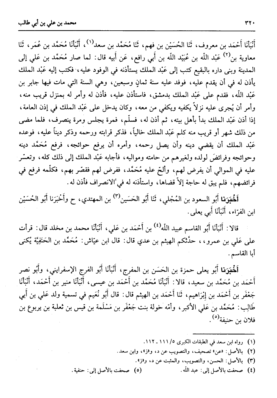 أنبأنا أحمد بن معروف ثنا الحسين بن فهم ثنا محمد بن سعد (1) أنبأنا محمد بن عمر ثنا معاوية بن (2) عبد الله بن عبيد الله بن أبي رافع عن أبيه قال لما صار محمد بن علي إلى المدينة وبنى داره بالبقيع كتب إلى عبد الملك يستأذنه في الوفود عليه فكتب إليه عبد الملك يأذن له في أن يقدم عليه فوفد عليه سنة ثمان وسبعين وهي السنة التي مات فيها جابر بن عبد الله فقدم على عبد الملك بدمشق فاستأذن عليه فأذن له وأمر له بمنزل قريب منه وأمر أن يجرى عليه نزلا يكفيه ويكفي من معه وكان يدخل على عبد الملك في إذن العامة إذا أذن عبد الملك بدأ بأهل بيته ثم أذن له فسلم فمرة يجلس ومرة ينصرف فلما مضى من ذلك شهر أو قريب منه كلم عبد الملك خاليا فذكر قرابته ورحمه وذكر دينا عليه فوعده عبد الملك أن يقضي دينه وأن يصل رحمه وأمره أن يرفع حوائجه فرفع محمد دينه وحوائجه وفرائض لولده ولغيرهم من حامته ومواليه فأجابه عبد الملك إلى ذلك كله وتعسر عليه في الموالي أن يفرض لهم وألح عليه محمد ففرض لهم فقصر بهم فكلمه فرفع في فرائضهم فلم يبق له حاجة إلا قضاها واستأذنه له في الانصراف فأذن له أخبرنا أبو السعود بن المجلي ثنا أبو الحسين (3) بن المهتدي وأخبرنا أبو الحسين بن الفراء أنبأنا أبي يعلى قالا أنبأنا أبو القاسم عبيد الله (4) بن أحمد بن علي أنبأنا محمد بن مخلد قال قرأت على علي بن عمرو حدثكم الهيثم بن عدي قال قال ابن عياش محمد بن الحنفية يكنى أبا القاسم أخبرنا أبو يعلى حمزة بن الحسن بن المفرج أنبأنا أبو الفرج الإسفرايني وأبو نصر أحمد بن محمد بن سعيد قالا أنبأنا محمد بن أحمد بن عيسى أنبأنا منير بن أحمد أنبأنا