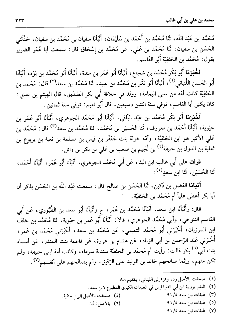 محمد بن عبد الله ثنا محمد بن أحمد بن سليمان أنبأنا سفيان بن محمد بن سفيان حدثني الحسن بن سفيان ثنا محمد بن علي عن محمد بن إسحاق قال سمعت أبا عمر الضرير يقول محمد بن الحنفية أبو القاسم أخبرنا أبو بكر محمد بن شجاع أنبأنا أبو عمر بن مندة أنبأنا أبو محمد بن يوة أنبأنا أبو الحسن اللنباني (1) أنبأنا أبو بكر بن محمد بن عبيد ثنا محمد بن سعد (2) قال محمد بن الحنفية كانت أمه من سبي اليمامة وولد في خلافة أبي بكر الصديق قال الهيثم بن عدي كان يكنى أبا القاسم توفي سنة اثنتين وسبعين قال أبو نعيم توفي سنة ثمانين أخبرنا أبو بكر محمد بن عبد الباقي أنبأنا أبو محمد الجوهري أنبأنا أبو عمر بن حيوية أنبأنا أحمد بن معروف ثنا الحسين بن محمد ثنا محمد بن سعد (3) قال محمد بن علي الأكبر هو ابن الحنفية وأمه خولة بنت جعفر بن قيس بن مسلمة بن ثعبة بن يربوع بن ثعلبة بن الدول بن حنيفة (4) بن لجيم بن صعب بن علي بن بكر بن وائل قرأت على أبي غالب ابن البنا عن أبي محمد الجوهري أنبأنا أبو عمر أنبأنا أحمد ثنا الحسين ثنا ابن سعد (5) أنبأنا الفضل بن دكين ثنا الحسن بن صالح قال سمعت عبد الله بن الحسن يذكر أن أبا بكر أعطى عليا أم محمد بن الحنفية قال وأنبأنا ابن سعد أنبأنا محمد بن عمر وأنبأنا أبو سعد بن الطيوري عن أبي القاسم التنوخي وأبي محمد الجوهري قالا أنبأنا أبو عمر بن حيوية ثنا محمد بن خلف ابن المرزبان أخبرني أبو محمد التميمي عن محمد بن سعد أخبرني محمد بن عمر أخبرني عبد الرحمن بن أبي الزناد عن هشام بن عروة عن فاطمة بنت المنذر عن أسماء بنت أبي (6) بكر قالت رأيت أم محمد بن الحنفية سندية سوداء وكانت أمة لبني حنيفة ولم تكن منهم وإنما صالحهم خالد بن الوليد على الرقيق ولم يصالحهم على أنفسهم (7)