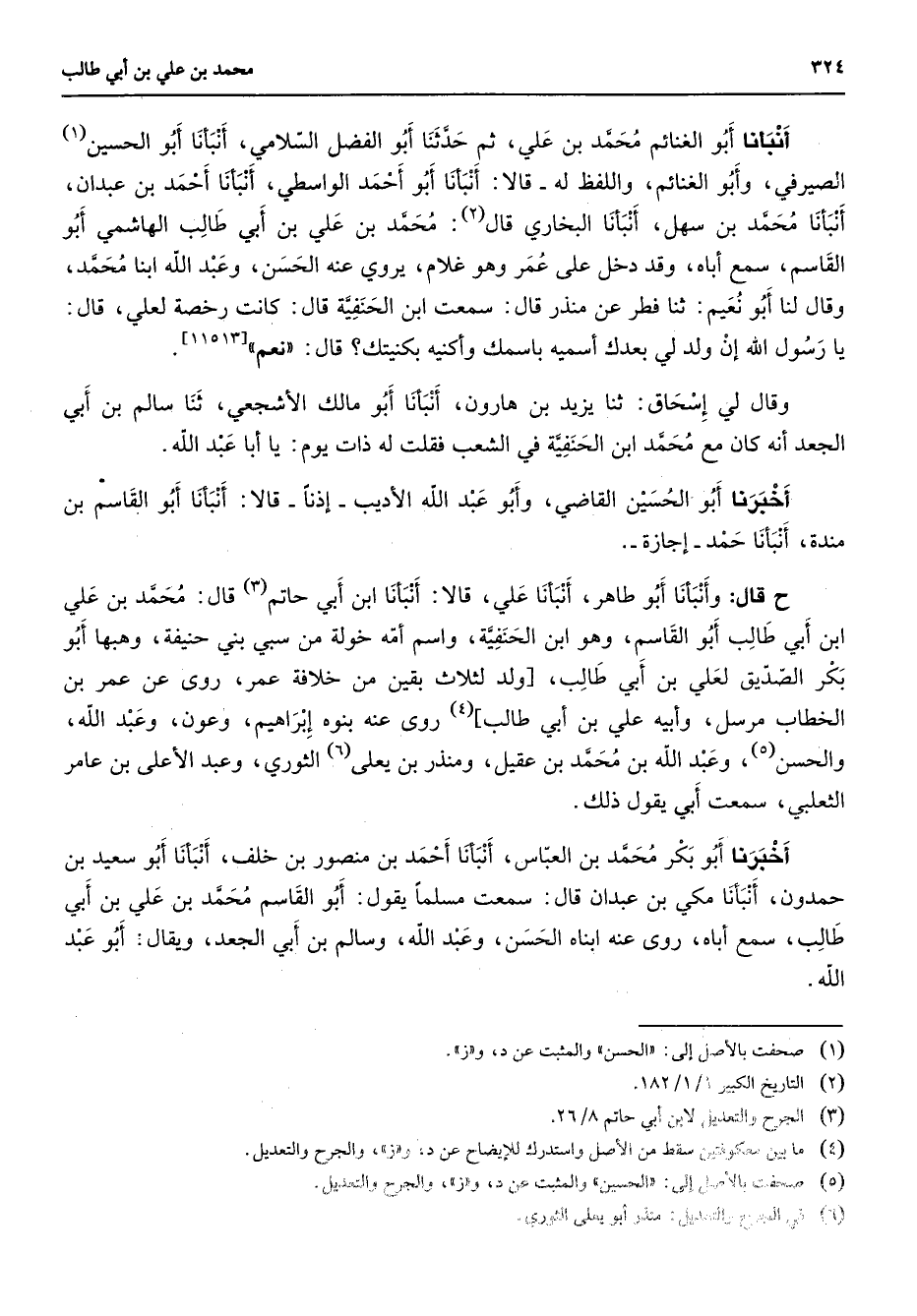 أنبأنا أبو الغنائم محمد بن علي ثم حدثنا أبو الفضل السلامي أنبأنا أبو الحسين (1) الصيرفي وأبو الغنائم واللفظ له قالا أنبأنا أبو أحمد الواسطي أنبأنا أحمد بن عبدان أنبأنا محمد بن سهل أنبأنا البخاري قال (2) محمد بن علي بن أبي طالب الهاشمي أبو القاسم سمع أباه وقد دخل على عمر وهو غلام يروي عنه الحسن وعبد الله ابنا محمد وقال لنا أبو نعيم ثنا فطر عن منذر قال سمعت ابن الحنفية قال كانت رخصة لعلي قال يا رسول الله إن ولد لي بعدك أسميه باسمك وأكنيه بكنيتك قال نعم