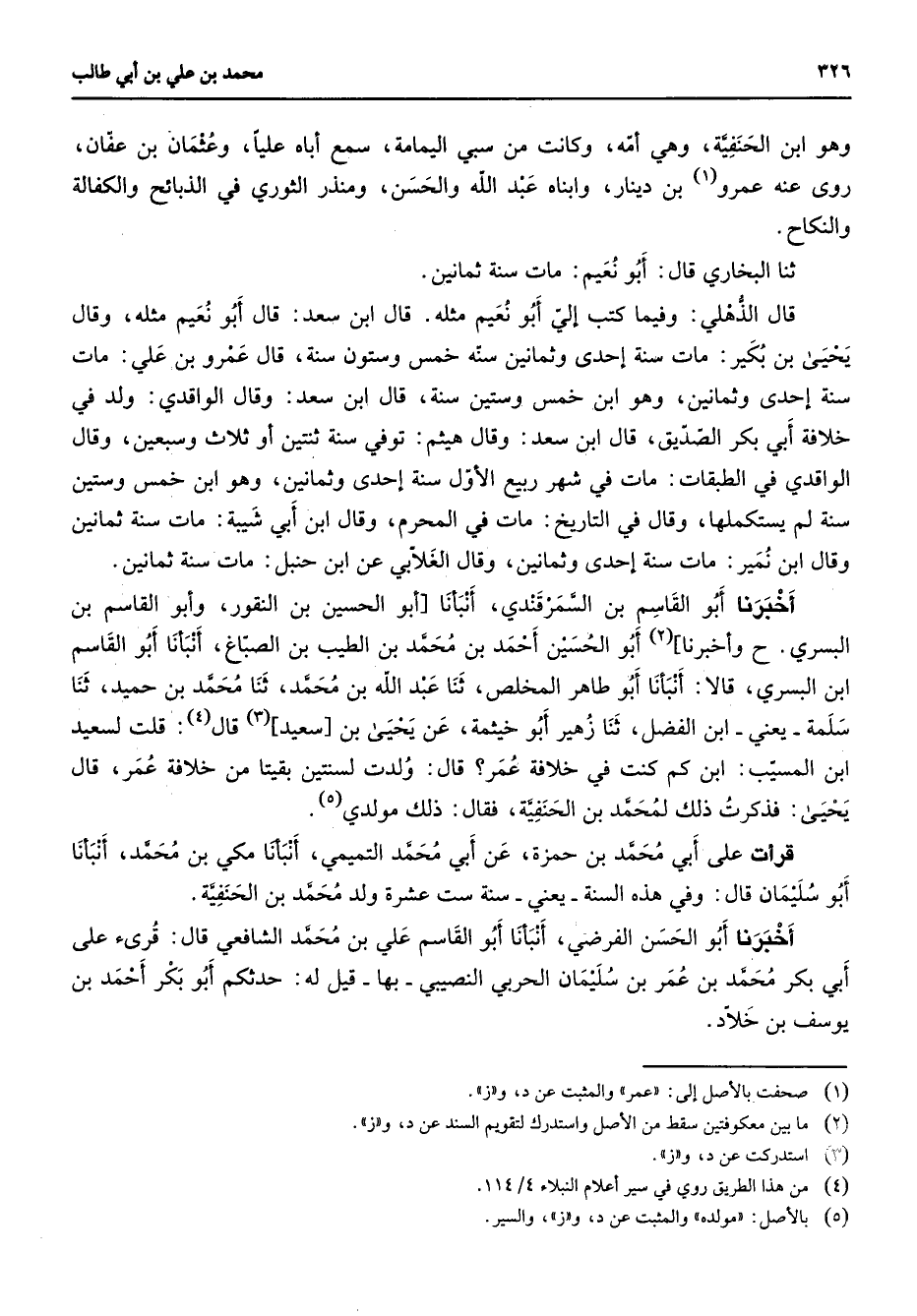 وهو ابن الحنفية وهي أمه وكانت من سبي اليمامة سمع أباه عليا وعثمان بن عفان روى عنه عمرو (2) بن دينار وابناه عبد الله والحسن ومنذر الثوري في الذبائح والكفالة والنكاح ثنا البخاري قال أبو نعيم مات سنة ثمانين قال الذهلي وفيما كتب إلي أبو نعيم مثله قال ابن سعد قال أبو نعيم مثله وقال يحيى بن بكير مات سنة إحدى وثمانين سنة خمس وستون سنة قال عمرو بن علي مات سنة إحدى وثمانين وهو ابن خمس وستين سنة قال ابن سعد وقال الواقدي ولد في خلافة أبي بكر الصديق قال ابن سعد وقال هيثم توفي سنة ثنتين أو ثلاث وسبعين وقال الواقدي في الطبقات مات في شهر ربيع الأول سنة إحدى وثمانين وهو ابن خمس وستين سنة لم يستكملها وقال في التاريخ مات في المحرم وقال ابن أبي شيبة مات سنة ثمانين وقال ابن نمير مات سنة إحدى وثمانين وقال الغلابي عن ابن حنبل مات سنة ثمانين أخبرنا أبو القاسم بن السمرقندي أنبأنا أبو الحسين بن النقور وأبو القاسم بن البسري وأخبرنا (2) أبو الحسين أحمد بن محمد بن الطيب بن الصباغ أنبأنا أبو القاسم ابن البسري قالا أنبأنا أبو طاهر المخلص ثنا عبد الله بن محمد ثنا محمد بن حميد ثنا سلمة يعني ابن الفضل ثنا زهير أبو خيثمة عن يحيى بن سعيد (3) قال (4) قلت لسعيد ابن المسيب ابن كم كنت في خلافة عمر قال ولدت لسنتين بقيتا من خلافة عمر قال يحيى فذكرت ذلك لمحمد بن الحنفية فقال ذلك مولدي (5) قرأت على أبي محمد بن حمزة عن أبي محمد التميمي أنبأنا مكي بن محمد أنبأنا أبو سليمان قال وفي هذه السنة يعني سنة ست عشرة ولد محمد بن الحنفية أخبرنا أبو الحسن الفرضي أنبأنا أبو القاسم علي بن محمد الشافعي قال قرئ على أبي بكر محمد بن عمر بن سليمان الحربي النصيبي بها قيل له حدثكم أبو بكر أحمد بن يوسف بن خلاد