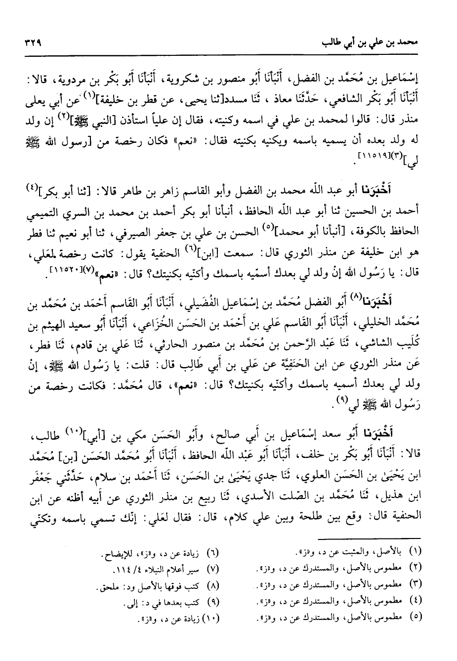 [11520] أخبرنا (8) أبو الفضل محمد بن إسماعيل الفضيلي أنبأنا أبو القاسم أحمد بن محمد بن محمد الخليلي أنبأنا أبو القاسم علي بن أحمد بن الحسن الخزاعي أنبأنا أبو سعيد الهيثم بن كليب الشاشي ثنا عبد الرحمن بن محمد بن منصور الحارثي ثنا علي بن قادم ثنا فطر عن منذر الثوري عن ابن الحنفية عن علي بن أبي طالب قال قلت يا رسول الله (صلى الله عليه وسلم) إن ولد لي بعدك أسميه باسمك وأكنيه بكنيتك قال نعم قال محمد فكانت رخصة من رسول الله (صلى الله عليه وسلم) لي (9) أخبرنا أبو سعد إسماعيل بن أبي صالح وأبو الحسن مكي بن أبي (10) طالب قالا أنبأنا أبو بكر بن خلف أنبأنا أبو عبد الله الحافظ أنبأنا أبو محمد الحسن بن محمد ابن يحيى بن الحسن العلوي ثنا جدي يحيى بن الحسن ثنا أحمد بن سلام حدثني جعفر ابن هذيل ثنا محمد بن الصلت الأسدي ثنا ربيع بن منذر الثوري عن أبيه أظنه عن ابن الحنفية قال وقع بين طلحة وبين علي كلام قال فقال لعلي إنك تسمي باسمه وتكني
