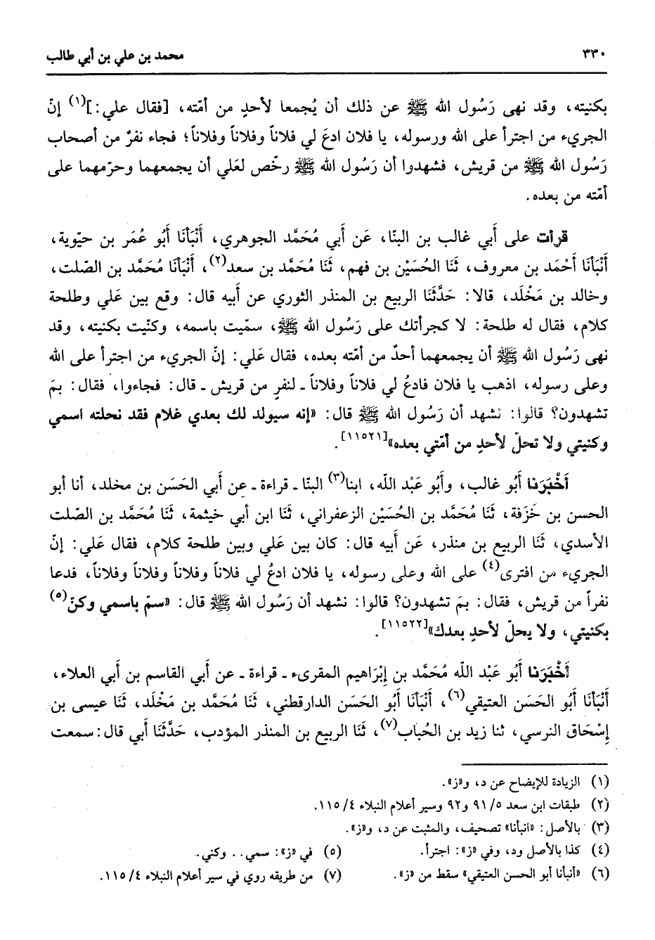 بكنيته وقد نهى رسول الله (صلى الله عليه وسلم) عن ذلك أن يجمعا لأحد من أمته فقال علي إن الجرئ من اجترأ على الله ورسوله يا فلان ادع لي فلانا وفلانا وفلانا فجاء نفر من أصحاب رسول الله (صلى الله عليه وسلم) من قريش فشهدوا أن رسول الله (صلى الله عليه وسلم) رخص لعلي أن يجمعهما وحرمهما على أمته من بعده قرأت على أبي غالب بن البنا عن أبي محمد الجوهري أنبأنا أبو عمر بن حيوية أنبأنا أحمد بن معروف ثنا الحسين بن فهم ثنا محمد بن سعد (2) أنبأنا محمد بن الصلت وخالد بن مخلد قالا حدثنا الربيع بن المنذر الثوري عن أبيه قال وقع بين علي وطلحة كلام فقال له طلحة لا كجرأتك على رسول الله (صلى الله عليه وسلم) سميت باسمه وكنيت بكنيته وقد نهى رسول الله (صلى الله عليه وسلم) أن يجمعهما أحد من أمته بعده فقال علي إن الجرئ من اجترأ على الله وعلى رسوله اذهب يا فلان فادع لي فلانا وفلانا لنفر من قريش قال فجاءوا فقال بم تشهدون قالوا نشهد أن رسول الله (صلى الله عليه وسلم) قال إنه سيولد لك بعدي غلام فقد نحلته اسمي وكنيتي ولا تحل لأحد من أمتي بعده