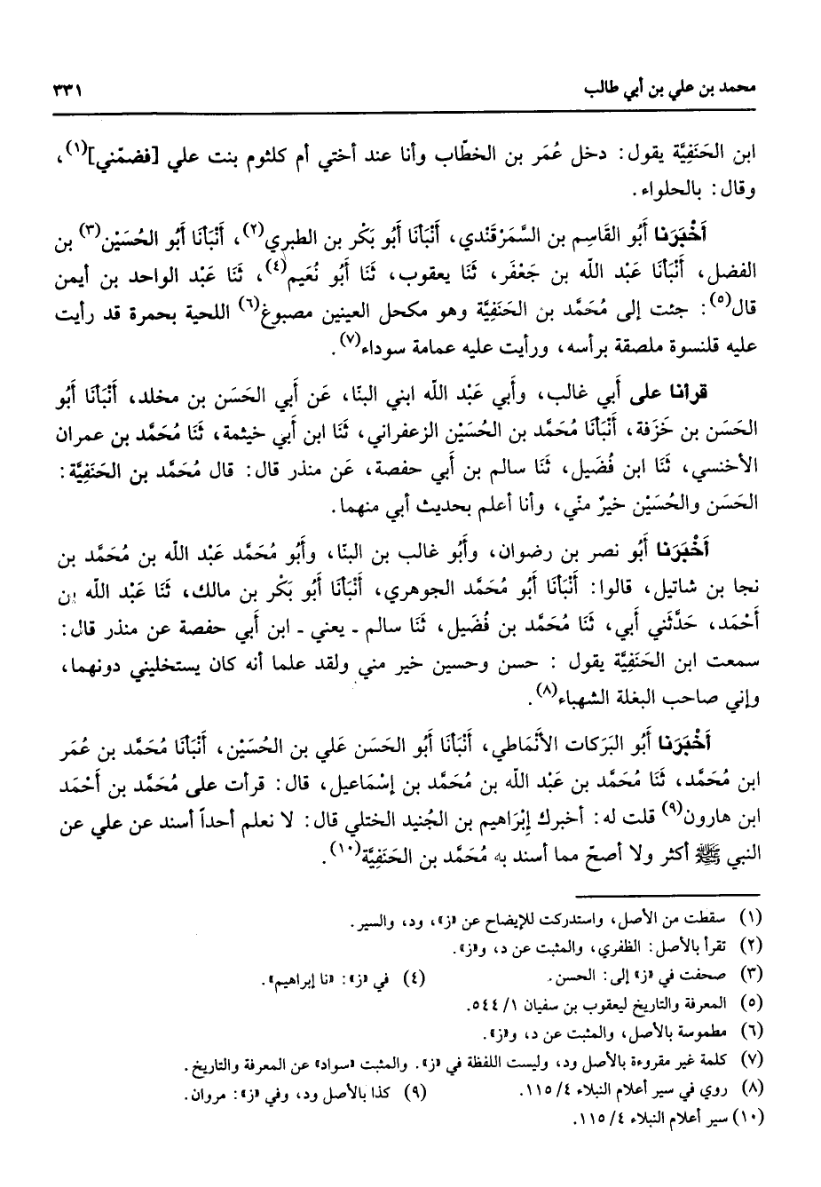ابن الحنفية يقول دخل عمر بن الخطاب وأنا عند أختي أم كلثوم بنت علي فضمني (1) وقال بالحلواء أخبرنا أبو القاسم بن السمرقندي أنبأنا أبو بكر بن الطبري (2) أنبأنا أبو الحسين (3) بن الفضل أنبأنا عبد الله بن جعفر ثنا يعقوب ثنا أبو نعيم (4) ثنا عبد الواحد بن أيمن قال (5) جئت إلى محمد بن الحنفية وهو مكحل العينين مصبوغ (6) اللحية بحمرة قد رأيت عليه قلنسوة ملصقة برأسه ورأيت عليه عمامة سوداء (7) قرأنا على أبي غالب وأبي عبد الله ابني البنا عن أبي الحسن بن مخلد أنبأنا أبو الحسن بن خزفة أنبأنا محمد بن الحسين الزعفراني ثنا ابن أبي خيثمة ثنا محمد بن عمران الأخنسي ثنا ابن فضيل ثنا سالم بن أبي حفصة عن منذر قال قال محمد بن الحنفية الحسن والحسين خير مني وأنا أعلم بحديث أبي منهما أخبرنا أبو نصر بن رضوان وأبو غالب بن البنا وأبو محمد عبد الله بن محمد بن نجا بن شاتيل قالوا أنبأنا أبو محمد الجوهري أنبأنا أبو بكر بن مالك ثنا عبد الله بن أحمد حدثني أبي ثنا محمد بن فضيل ثنا سالم يعني ابن أبي حفصة عن منذر قال سمعت ابن الحنفية يقول حسن وحسين خير مني ولقد علما أنه كان يستخليني دونهما وإني صاحب البغلة الشهباء (8) أخبرنا أبو البركات الأنماطي أنبأنا أبو الحسن علي بن الحسين أنبأنا محمد بن عمر ابن محمد ثنا محمد بن عبد الله بن محمد بن إسماعيل قال قرأت على محمد بن أحمد ابن هارون (9) قلت له أخبرك إبراهيم بن الجنيد الختلي قال لا نعلم أحدا أسند عن علي عن النبي (صلى الله عليه وسلم) أكثر ولا أصح مما أسند به محمد بن الحنفية (10)