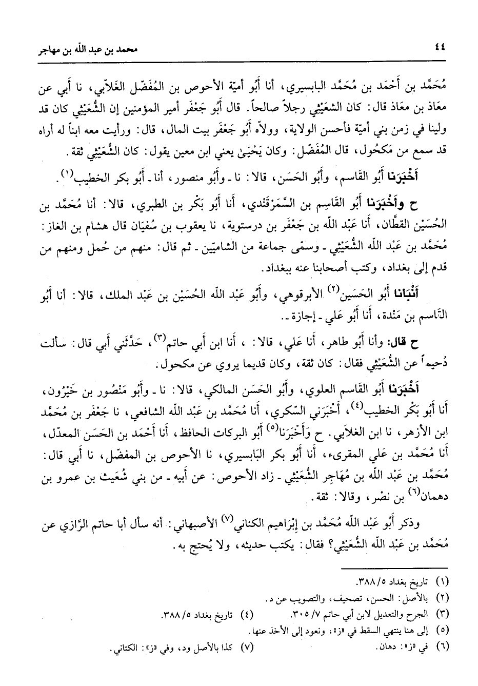 محمد بن أحمد بن محمد البابسيري أنا أبو أمية الأحوص بن المفضل الغلابي نا أبي عن معاذ بن معاذ قال كان الشعيثي رجلا صالحا قال أبو جعفر أمير المؤمنين إن الشعيثي كان قد ولينا في زمن بني أمية فأحسن الولاية وولاه أبو جعفر بيت المال قال ورأيت معه ابنا له أراه قد سمع من مكحول قال المفضل وكان يحيى يعني ابن معين يقول كان الشعيثي ثقة أخبرنا أبو القاسم وأبو الحسن قالا نا وأبو منصور أنا أبو بكر الخطيب (1) ح وأخبرنا أبو القاسم بن السمرقندي أنا أبو بكر بن الطبري قالا أنا محمد بن الحسين القطان أنا عبد الله بن جعفر بن درستوية نا يعقوب بن سفيان قال هشام بن الغاز محمد بن عبد الله الشعيثي وسمى جماعة من الشاميين ثم قال منهم من حمل ومنهم من قدم إلى بغداد وكتب أصحابنا عنه ببغداد أنبأنا أبو الحسين (2) الأبرقوهي وأبو عبد الله الحسين بن عبد الملك قالا أنا أبو القاسم بن مندة أنا أبو علي إجازة ح قال وأنا أبو طاهر أنا علي قالا أنا ابن أبي حاتم (3) حدثني أبي قال سألت دحيما عن الشعيثي فقال كان ثقة وكان قديما يروي عن مكحول أخبرنا أبو القاسم العلوي وأبو الحسن المالكي قالا نا وأبو منصور بن خيرون أنا أبو بكر الخطيب (4) أخبرني السكري أنا محمد بن عبد الله الشافعي نا جعفر بن محمد ابن الأزهر نا ابن الغلابي وأخبرنا (5) أبو البركات الحافظ أنا أحمد بن الحسن المعدل أنا محمد بن علي المقرئ أنا أبو بكر البابسيري نا الأحوص بن المفضل نا أبي قال محمد بن عبد الله بن مهاجر الشعيثي زاد الأحوص عن أبيه من بني شعيب بن عمرو بن دهمان (6) بن نصر وقالا ثقة وذكر أبو عبد الله محمد بن إبراهيم الكناني (7) الأصبهاني أنه سأل أبا حاتم الرازي عن محمد بن عبد الله الشعيثي فقال يكتب حديثه ولا يحتج به