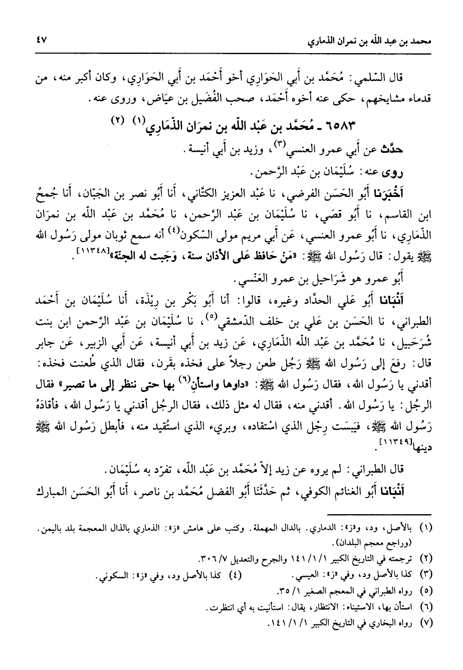 6583 - محمد بن عبد الله بن نمران الذماري (1) (2) حدث عن أبي عمرو العنسي (3) وزيد بن أبي أنيسة روى عنه سليمان بن عبد الرحمن أخبرنا أبو الحسن الفرضي نا عبد العزيز الكتاني أنا أبو نصر بن الجبان أنا جمح ابن القاسم نا أبو قصي نا سليمان بن عبد الرحمن نا محمد بن عبد الله بن نمران الذماري نا أبو عمر العنسي عن أبي مريم مولى السكون (4) أنه سمع ثوبان مولى رسول الله (صلى الله عليه وسلم) يقول قال رسول الله (صلى الله عليه وسلم) من حافظ على الأذان سنة وجبت له الجنة