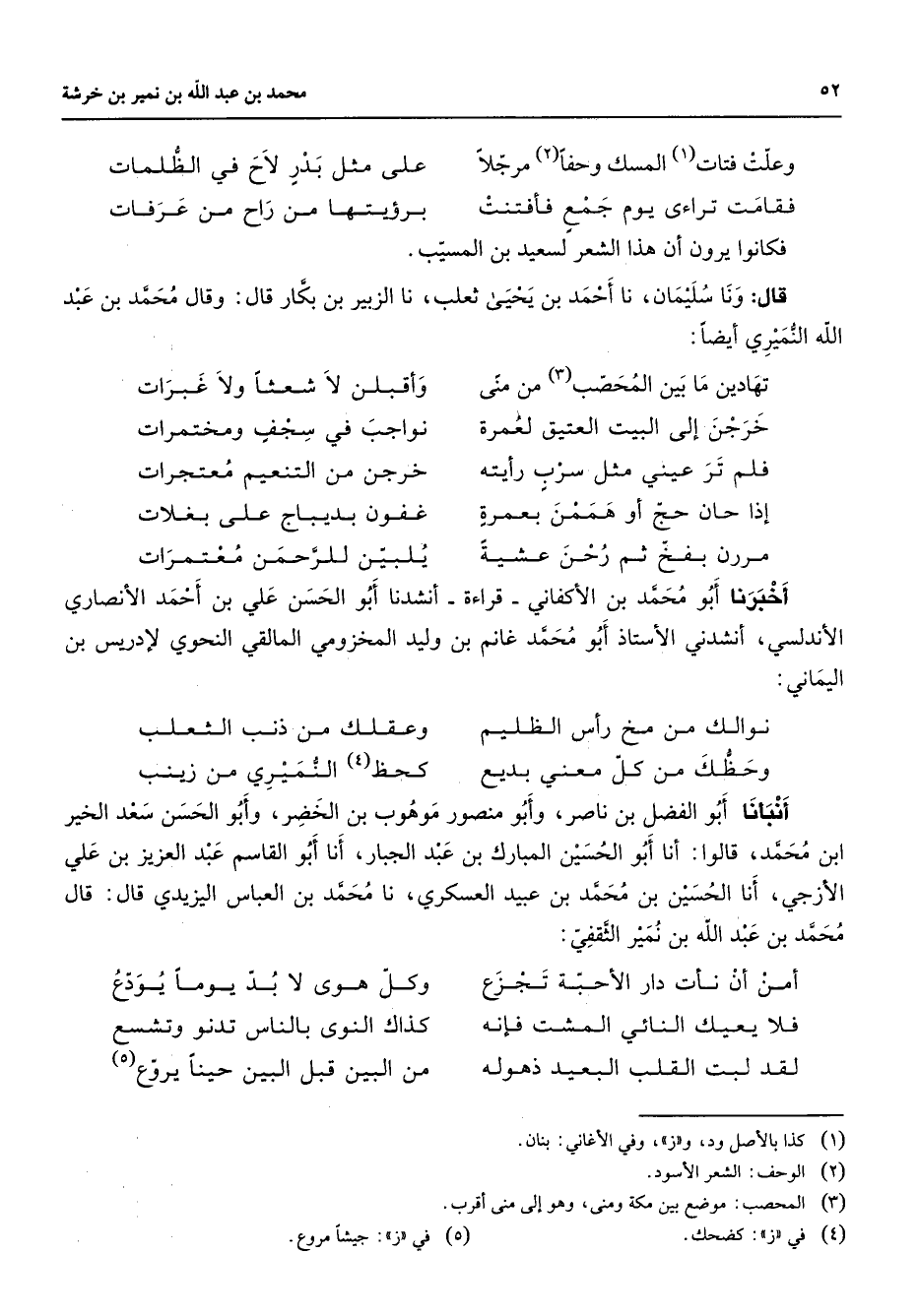 وعلت فتات (1) المسك وحفا (2) * مرجلا على مثل بدر لاح في الظلمات فقامت تراءى يوم جمع فأفتنت * برؤيتها من راح من عرفات * فكانوا يرون أن هذا الشعر لسعيد بن المسيب قال ونا سليمان نا أحمد بن يحيى ثعلب نا الزبير بن بكار قال وقال محمد بن عبد الله النميري أيضا * تهادين ما بين المحصب (3) من منى * وأقبلن لا شعثا ولا غبرات خرجن إلى البيت العتيق لعمرة * نواجب في سجف ومختمرات فلم تر عيني مثل سرب رأيته * خرجن من التنعيم معتجرات إذا حان حج أو هممن بعمرة * غفون بديباج على بغلات مررن بفخ ثم رحن عشية * يلبين للرحمن معتمرات * أخبرنا أبو محمد بن الأكفاني قراءة أنشدنا أبو الحسن علي بن أحمد الأنصاري الأندلسي أنشدني الأستاذ أبو محمد غانم بن وليد المخزومي المالقي النحوي لإدريس بن اليماني * نوالك من مخ رأس الظليم * وعقلك من ذنب الثعلب وحظك من كل معنى بديع * كحظ (4) النميري من زينب * أنبأنا أبو الفضل بن ناصر وأبو منصور موهوب بن الخضر وأبو الحسن سعد الخيري ابن محمد قالوا أنا أبو الحسين المبارك بن عبد الجبار أنا أبو القاسم عبد العزيز بن علي الأزجي أنا الحسين بن محمد بن عبيد العسكري نا محمد بن العباس اليزيدي قال قال محمد بن عبد الله بن نمير الثقفي * أمن أن نأت دار الأحبة تجزع * وكل هوى لا بد يوما يودع فلا يعيك النائي المشت فإنه * كذاك النوى بالناس تدنو وتشسع لقد لبت القلب البعيد ذهوله * من البين قبل البين حينا يروع (5)