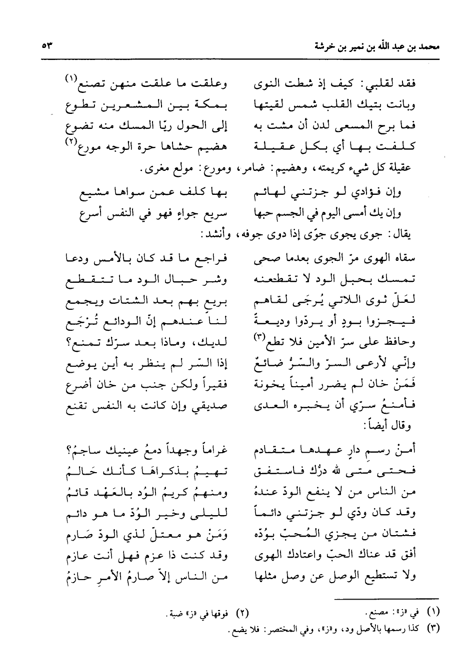 فقد لقلبي كيف إذ شطت النوى * وعلقت ما علقت منهن تصنع (1) وبانت بتيك القلب شمس لقيتها * بمكة بين المشعرين تطوع فما برح المسعى لدن أن مشت به * إلى الحول ريا المسك منه تضوع كلفت بها أي بكل عقيلة * هضيم حشاها حرة الوجه مورع (2) * عقيلة كل شئ كريمته وهضيم ضامر ومورع مولع مغرى * وإن فؤادي لو جزتني لهائم * بها كلف عمن سواها مشيع وإن يك أمسى اليوم في الجسم حبها * سريع جواء فهو في النفس أسرع * يقال جوى يجوى جوى إذا دوى جوفه وأنشد * سقاه الهوى مر الجوى بعدما صحي * فراجع ما قد كان بالأمس ودعا تمسك بحبل الود لا تقطعنه * وشر حبال الود ما تتقطع لعل ثوى اللاتي يرجى لقاهم * بريع بهم بعد الشتات ويجمع فيجزوا بود أو يردوا وديعة * لنا عندهم إن الودائع ترجع وحافظ على سر الأمين فلا تطع (3) * لديك وماذا بعد سرك تمنع وإني لأرعى السر والسر ضائع * إذا السر لم ينظر به أين يوضع فمن خان لم يضرر أمينا يخونه * فقيرا ولكن جنب من خان أضرع فأمنع سري أن يخبره العدى * صديقي وإن كانت به النفس تقنع * وقال أيضا * أمن رسم دار عهدها متقادم * غراما وجهدا دمع عينيك ساجم فحتى متى لله درك فاستفق * تهيم بذكراها كأنك حالم من الناس من لا ينفع الود عنده * ومنهم كريم الود بالعهد قائم وقد كان ودي لو جزتني دائما * لليلى وخير الود ما هو دائم فشتان من يجزي المحب بوده * ومن هو معتل لذي الود صارم أفق قد عناك الحب واعتادك الهوى * وقد كنت ذا عزم فهل أنت عازم ولا تستطيع الوصل عن وصل مثلها * من الناس إلا صارم الأمر حازم