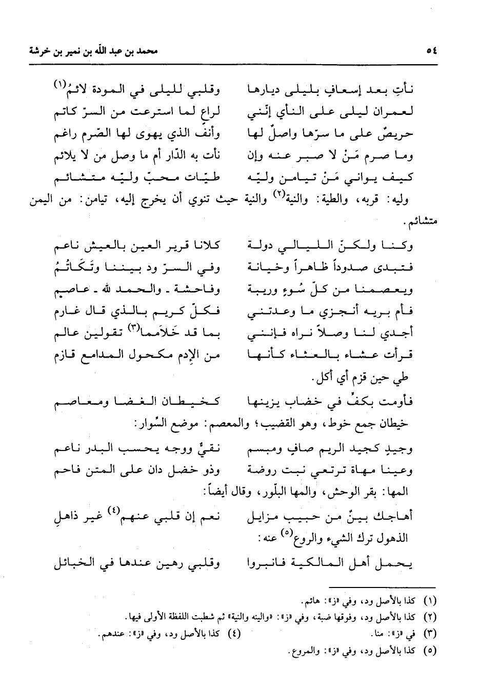 نأت بعد إسعاف بليلى ديارها * وقلبي لليلى في المودة لائم (1) لعمران ليلى على النأي إنني * لراع لما استرعت من السر كاتم حريص على ما سرها واصل لها * وأنف الذي يهوى لها الصرم راغم وما صرم من لا صبر عنه وإن * نأت به الدار أم ما وصل من لا يلائم كيف يواني من تيامن وليه * طيات محب وليه متشائم * وليه قربة والطية والنية (2) والنية حيث تنوي أن يخرج إليه تيامن من اليمن متشائم * وكنا ولكن الليالي دولة * كلانا قرير العين بالعيش ناعم فتبدى صدودا ظاهرا وخيانة * وفي السر ود بيننا وتكاتم ويعصمنا من كل سوء وريبة * وفاحشة والحمد لله عاصم فأم برية أنجزي ما وعدتني * فكل كريم بالذي قال غارم أجدي لنا وصلا نراه فإنني * بما قد خلامما (3) تقولين عالم قرأت عشاء بالعثاء كأنها * من الإدم مكحول المدامع قازم * طي حين قزم أي أكل * فأومت بكف في خضاب يزينها * كخيطان الغضا ومعاصم * خيطان جمع خوط وهو القضيب والمعصم موضع السوار * وجيد كجيد الريم صاف ومبسم * نقي ووجه يحسب البدر ناعم وعينا مهاة ترتعي نبت روضة * وذو خضل دان على المتن فاحم * المها بقر الوحش والمها البلور وقال أيضا * أهاجك بين من حبيب مزايل * نعم إن قلبي عنهم (4) غير ذاهل * الذهول ترك الشئ والروع (5) عنه * يحمل أهل المالكية فانبروا * وقلبي رهين عندها في الخبائل *