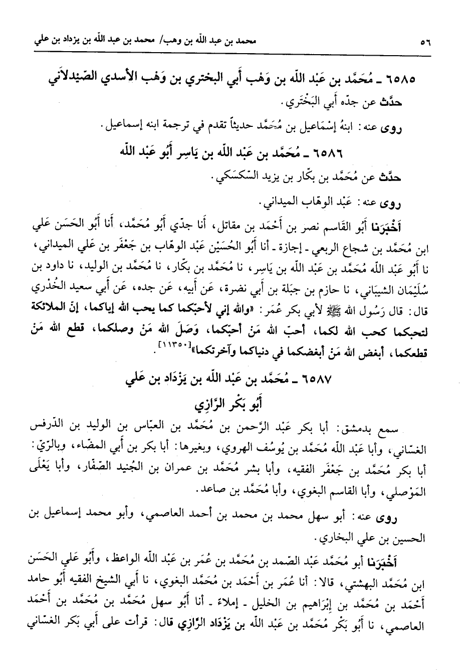 6586 - محمد بن عبد الله بن ياسر أبو عبد الله حدث عن محمد بن بكار بن يزيد السكسكي روى عنه عبد الوهاب الميداني أخبرنا أبو القاسم نصر بن أحمد بن مقاتل أنا جدي أبو محمد أنا أبو الحسن علي ابن محمد بن شجاع الربعي إجازة أنا أبو الحسين عبد الوهاب بن جعفر بن علي الميداني نا أبو عبد الله محمد بن عبد الله بن ياسر نا محمد بن بكار نا محمد بن الوليد نا داود بن سليمان الشيباني نا حازم بن جبلة بن أبي نضرة عن أبيه عن جده عن أبي سعيد الخدري قال قال رسول الله (صلى الله عليه وسلم) لأبي بكر عمر والله إني لأحبكما كما يحب الله إياكما إن الملائكة لتحبكما كحب الله لكما أحب الله من أحبكما وصل الله من وصلكما قطع الله من قطعكما أبغض الله من أبغضكما في دنياكما وآخرتكما