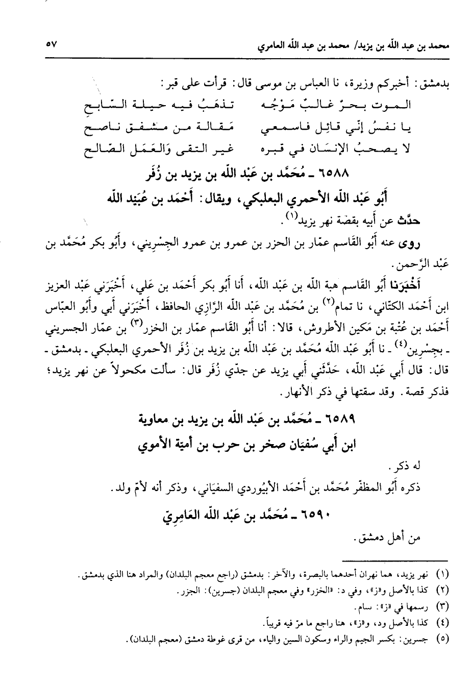 6588 - محمد بن عبد الله بن يزيد بن زفر أبو عبد الله الأحمري البعلبكي ويقال أحمد بن عبيد الله حدث عن أبيه بقصة نهر يزيد (1) روى عنه أبو القاسم عمار بن الحزر بن عمرو بن عمرو الجسريني وأبو بكر محمد بن عبد الرحمن أخبرنا أبو القاسم هبة الله بن عبد الله أنا أبو بكر أحمد بن علي أخبرني عبد العزيز ابن أحمد الكتاني نا تمام (2) بن محمد بن عبد الله الرازي الحافظ أخبرني أبي وأبو العباس أحمد بن عتبة بن مكين الأطروش قالا أنا أبو القاسم عمار بن الخزر (3) بن عمار الجسريني بجسرين (4) نا أبو عبد الله محمد بن عبد الله بن يزيد بن زفر الأحمري البعلبكي بدمشق قال قال أبي عبد الله حدثني أبي يزيد عن جدي زفر قال سألت مكحولا عن نهر يزيد فذكر قصة وقد سقتها في ذكر الأنهار