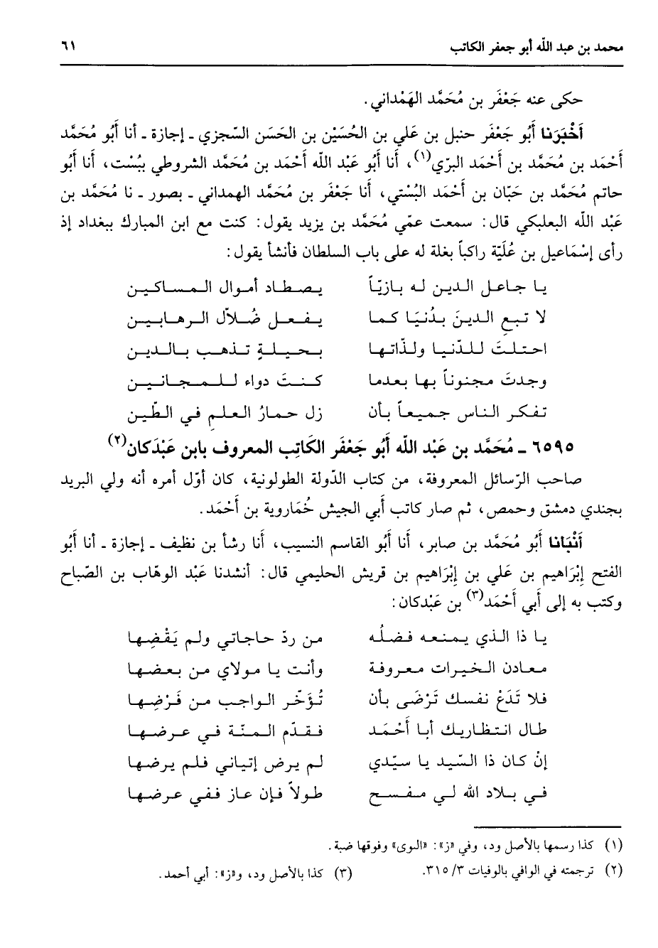 6595 - محمد بن عبد الله أبو جعفر الكاتب المعروف بابن عبد كان (2) صاحب الرسائل المعروفة من كتاب الدولة الطولونية كان أول أمره أنه ولي البريد بجندي دمشق وحمص ثم صار كاتب أبي الجيش خماروية بن أحمد أنبأنا أبو محمد بن صابر أنا أبو القاسم النسيب أنا رشأ بن نظيف إجازة أنا أبو الفتح إبراهيم بن علي بن إبراهيم بن قريش الحليمي قال أنشدنا عبد الوهاب بن الصباح وكتب به إلى أبي أحمد (3) بن عبد كان * يا ذا الذي يمنعه فضله * من رد حاجاتي ولم يقضها معادن الخيرات معروفة * وأنت يا مولاي من بعضها فلا تدع نفسك ترضى بأن * تؤخر الواجب من فرضها طال انتظاريك أبا أحمد * فقدم المنة في عرضها إن كان ذا السيد يا سيدي * لم يرض إتياني فلم يرضها في بلاد الله لي مفسح * طولا فإن عاز ففي عرضها
