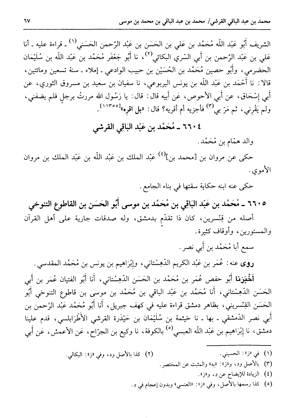 6605 - محمد بن عبد الباقي بن محمد بن موسى أبو الحسن بن القاطوع التنوخي أصله من قنسرين كان ذا تقدم بدمشق وله صدقات جارية على أهل القرآن والمستورين وأوقاف كثيرة سمع أبا محمد بن أبي نصر روى عنه عمر بن عبد الكريم الدهستاني وإبراهيم بن يونس بن محمد المقدسي أخبرنا أبو حفص عمر بن محمد بن الحسن الدهستاني أنا أبو الفتيان عمر بن أبي الحسن الدهستاني أنا محمد بن عبد الباقي بن محمد بن موسى بن قاطوع التنوخي أبو الحسن القنسريني بظاهر دمشق قراءة عليه في كهف جبريل أنا أبو محمد عبد الرحمن بن أبي نصر الدمشقي بها نا خيثمة بن سليمان بن حيدرة القرشي الأطرابلسي قدم علينا دمشق نا إبراهيم بن عبد الله العبسي (5) بالكوفة نا وكيع بن الجراح عن الأعمش عن أبي