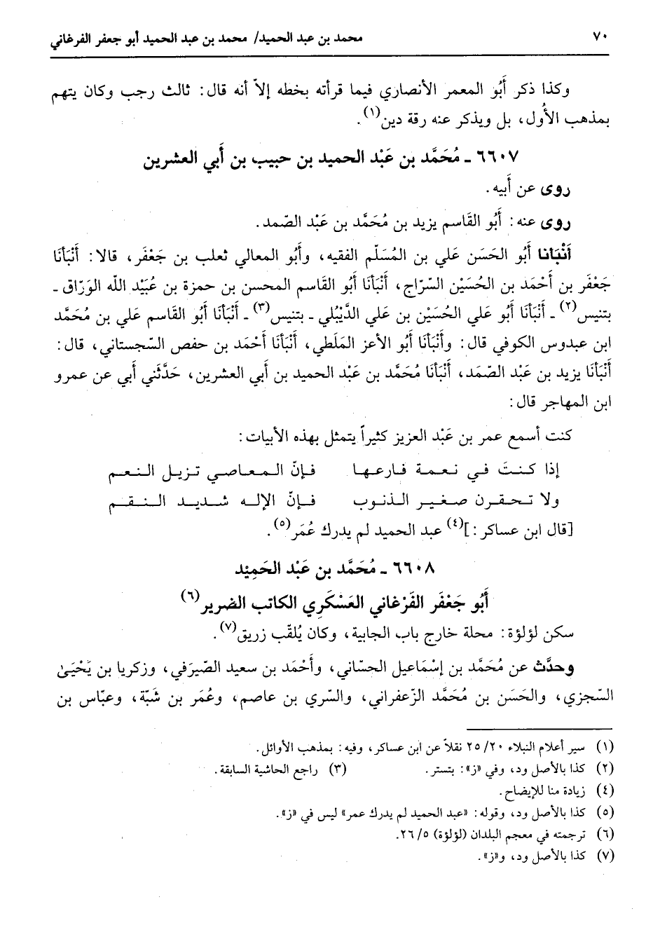 6607 - محمد بن عبد الحميد بن حبيب بن أبي العشرين روى عن أبيه روى عنه أبو القاسم يزيد بن محمد بن عبد الصمد