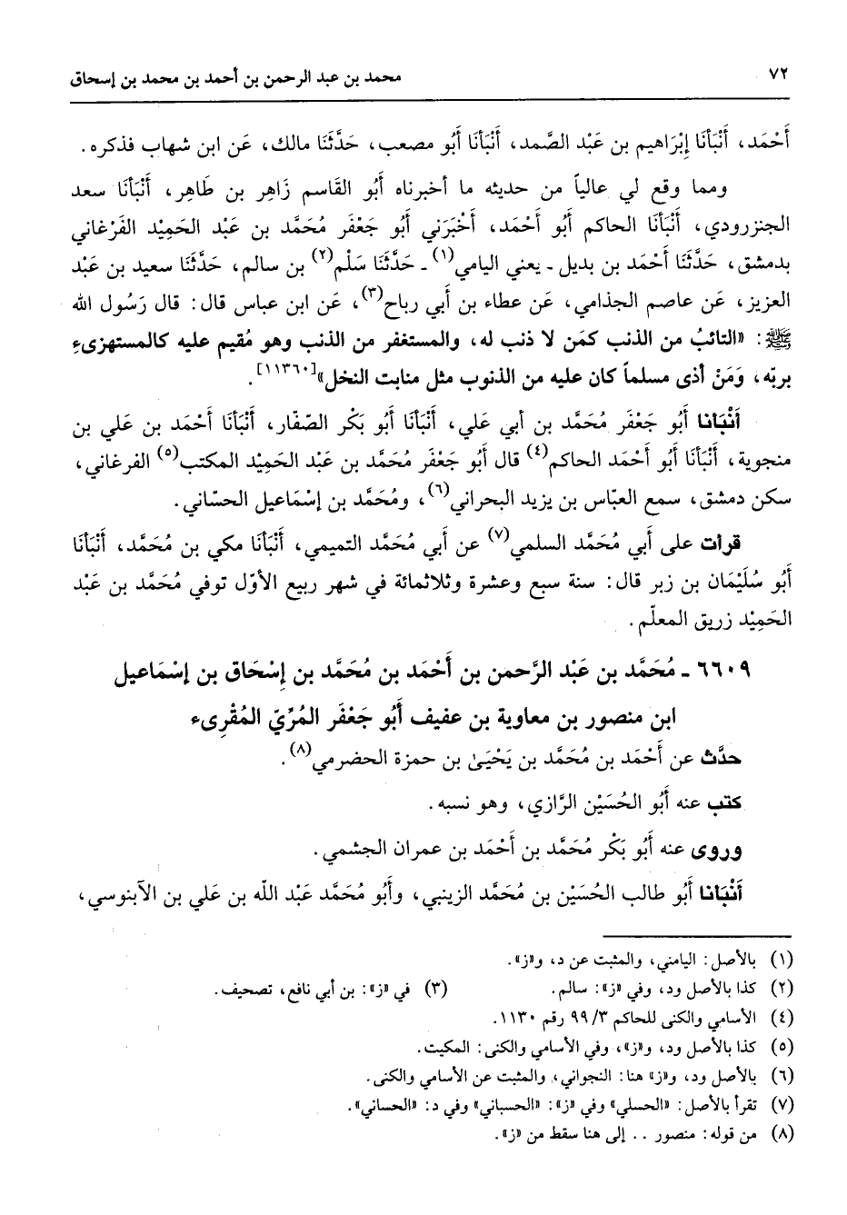 أنبأنا إبراهيم بن عبد الصمد أنبأنا أبو مصعذب حدثنا مالك عن ابن شهاب فذكره ومما وقع لي عاليا من حديثه ما أخبرناه أبو القاسم زاهر بن طاهر أنبأنا سعد الجنزرودي أنبأنا الحاكم أبو أحمد أخبرني أبو جعفر محمد بن عبد الحميد الفرغاني بدمشق حدثنا أحمد بن بديل يعني اليامي (1) حدثنا سلم (2) بن سالم حدثنا سعيد بن عبد العزيز عن عاصم الجذامي عن عطاء بن أبي رباح (3) عن ابن عباس قال قال رسول الله (صلى الله عليه وسلم) التائب من الذنب كمن لا ذنب له والمستغفر من الذنب وهو مقيم عليه كالمستهزئ بربه ومن أذى مسلما كان عليه من الذنوب مثل منابت النخل