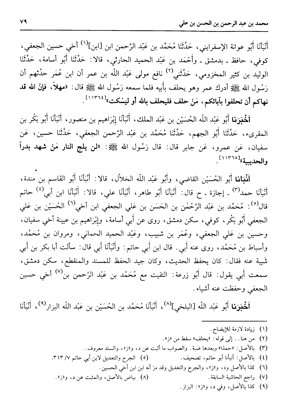 أنبأنا أبو عوانة الإسفرايني حدثنا محمد بن عبد الرحمن ابن ابن (1) أخي حسين الجعفي كوفي حافظ بدمشق وأحمد بن عبد الحميد الحارثي قالا حدثنا أبو أسامة حدثنا الوليد بن كثير المخزومي حح حدثني (2) نافع مولى عبد الله بن عمر ان ابن عمر حدثهم أن رسول الله (صلى الله عليه وسلم) أدرك عمر وهو يحلف بأبيه فلما سمعه رسول الله (صلى الله عليه وسلم) قال مهلا فإن الله قد نهاكم أن تحلفوا بآبائكم من حلف فليحلف بالله أو ليسكت