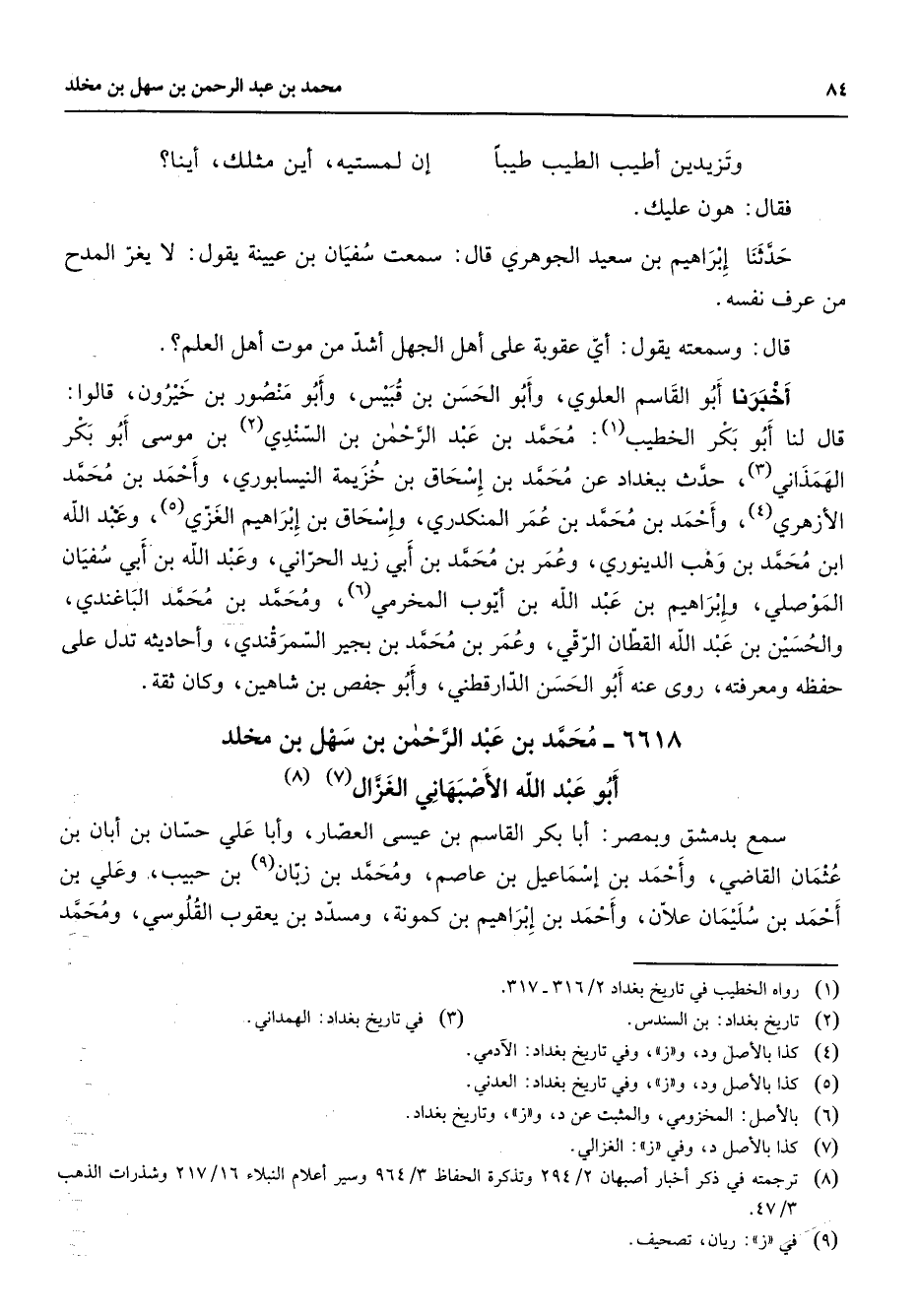 6618 - محمد بن عبد الرحمن بن سهل بن مخلد أبو عبد الله الأصبهاني الغزال (7) (8) سمع بدمشق وبمصر أبا بكر القاسم بن عيسى العصار وأبا علي حسان بن أبان بن عثمان القاضي وأحمد بن إسماعيل بن عاصم ومحمد بن زبان (9) بن حبيب وعلي بن أحمد بن سليمان علان وأحمد بن إبراهيم بن كمونة ومسدد بن يعقوب القلوسي ومحمد