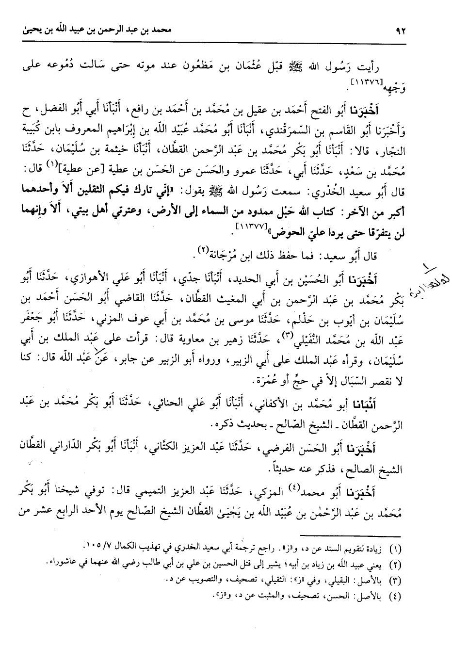 [11377] قال أبو سعيد فما حفظ ذلك ابن مرجانة (2) أخبرنا أبو الحسين بن أبي الحديد أنبأنا جدي أنبأنا أبو علي الأهوازي حدثنا أبو بكر محمد بن عبد الرحمن بن أبي المغيث القطان حدثنا القاضي أبو الحسن أحمد بن سليمان بن أيوب بن حذلم حدثنا موسى بن محمد بن أبي عوف المزني حدثنا أبو جعفر عبد الله بن محمد النفيلي (3) حدثنا زهير بن معاوية قال قرأت على عبد الملك بن أبي سليمان وقرأه عبد الملك على أبي الزبير ورواه أبو الزبير عن جابر عن عبد الله قال كنا لا نقصر السبال إلا في حج أو عمرة أنبأنا أبو محمد بن الأكفاني أنبأنا أبو علي الحنائي حدثنا أبو بكر محمد بن عبد الرحمن القطان الشيخ الصالح بحديث ذكره أخبرنا أبو الحسن الفرضي حدثنا عبد العزيز الكتاني أنبأنا أبو بكر الداراني القطان الشيخ الصالح فذكر عنه حديثا أخبرنا أبو محمد (4) المزكي حدثنا عبد العزيز التميمي قال توفي شيخنا أبو بكر محمد بن عبد الرحمن بن عبيد الله بن يحيى القطان الشيخ الصالح يوم الأحد الرابع عشر من