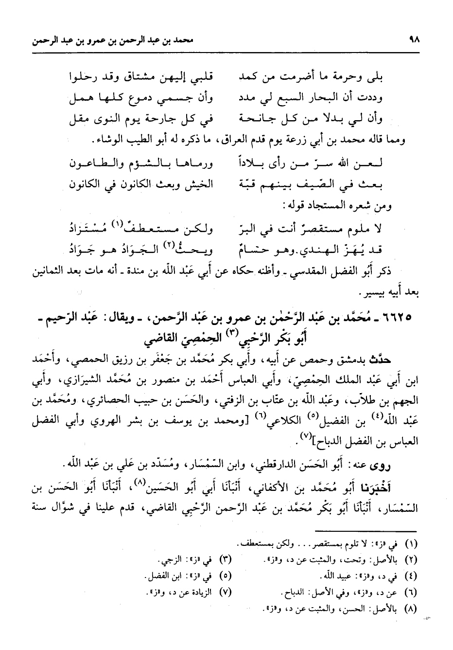6625 - محمد بن عبد الرحمن بن عمرو بن عبد الرحمن ويقال عبد الرحيم أبو بكر الرحبي (3) الحمصي القاضي حدث بدمشق وحمص عن أبيه وأبي بكر محمد بن جعفر بن رزيق الحمصي وأحمد ابن أبي عبد الملك الحمصي وأبي العباس أحمد بن منصور بن محمد الشيرازي وأبي الجهم بن طلاب وعبد الله بن عتاب بن الزفتي والحسن بن حبيب الحصائري ومحمد بن عبد الله (4) بن الفضيل (5) الكلاعي (6) ومحمد بن يوسف بن بشر الهروي وأبي الفضل العباس بن الفضل الدباح (7) روى عنه أبو الحسن الدارقطني وابن السمسار ومسدد بن علي بن عبد الله أخبرنا أبو محمد بن الأكفاني أنبأنا أبي أبو الحسين أنبأنا أبو الحسن بن السمسار أنبأنا أبو بكر محمد بن عبد الرحمن الرحبي القاضي قدم علينا في شوال سنة